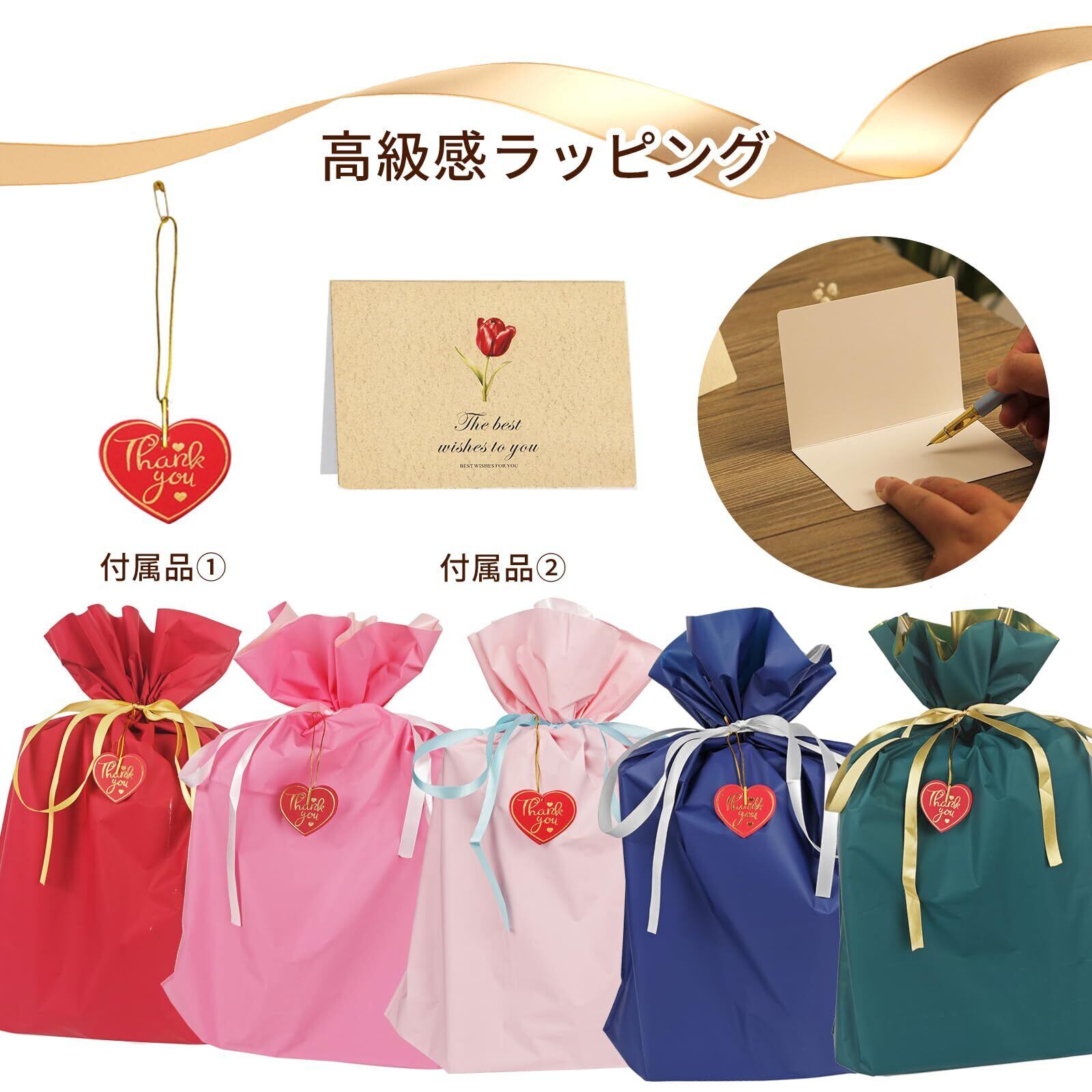 ラッピング袋 大 リボン付 (W56×H45cm) メッセージカードと金糸のタグが付属【梨地光沢・二重構造・防水】巾着袋 プレゼント袋大 ギフトラッピング バレンタインデー ホワイトデー クリスマス ハロウィン 卒業式 誕生日包装
