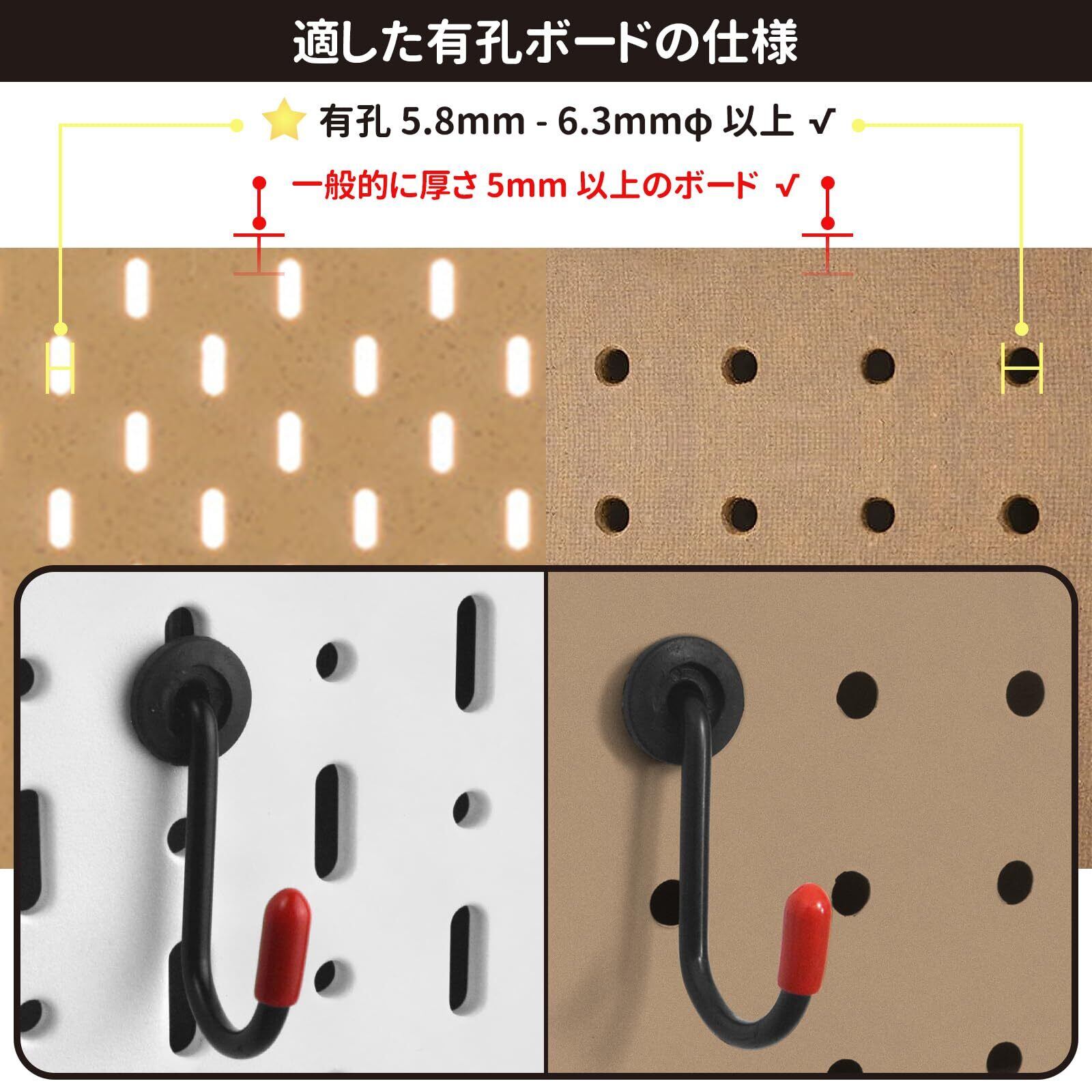 適用:専用J型フックをペグボードに取り付けるのにはとても便利です。使用中も安定し、安全です。 適用ペグボードの厚さ:5mm以上の厚さに対応しています。穴のサイズ:直径5.8-6.3mm以上の穴に適用です。