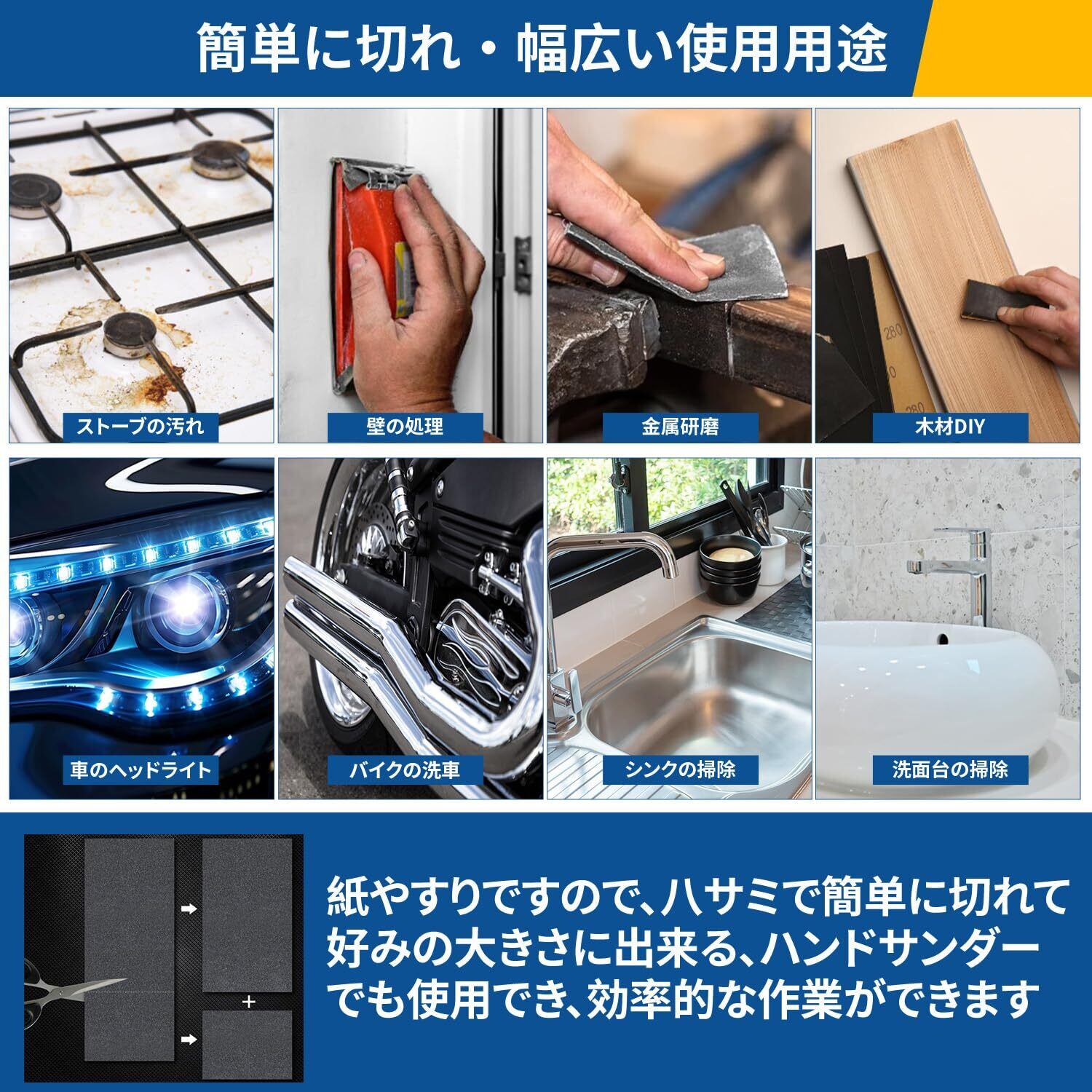 【幅広い使用用途】耐水ヤスリは、ヘッドライト磨き、板金の塗装、シンクの研磨、陶器・ガラス・木材・金属板の加工、木製家具の表面処理、サビ落としなど、多様な用途にご利用いただけます