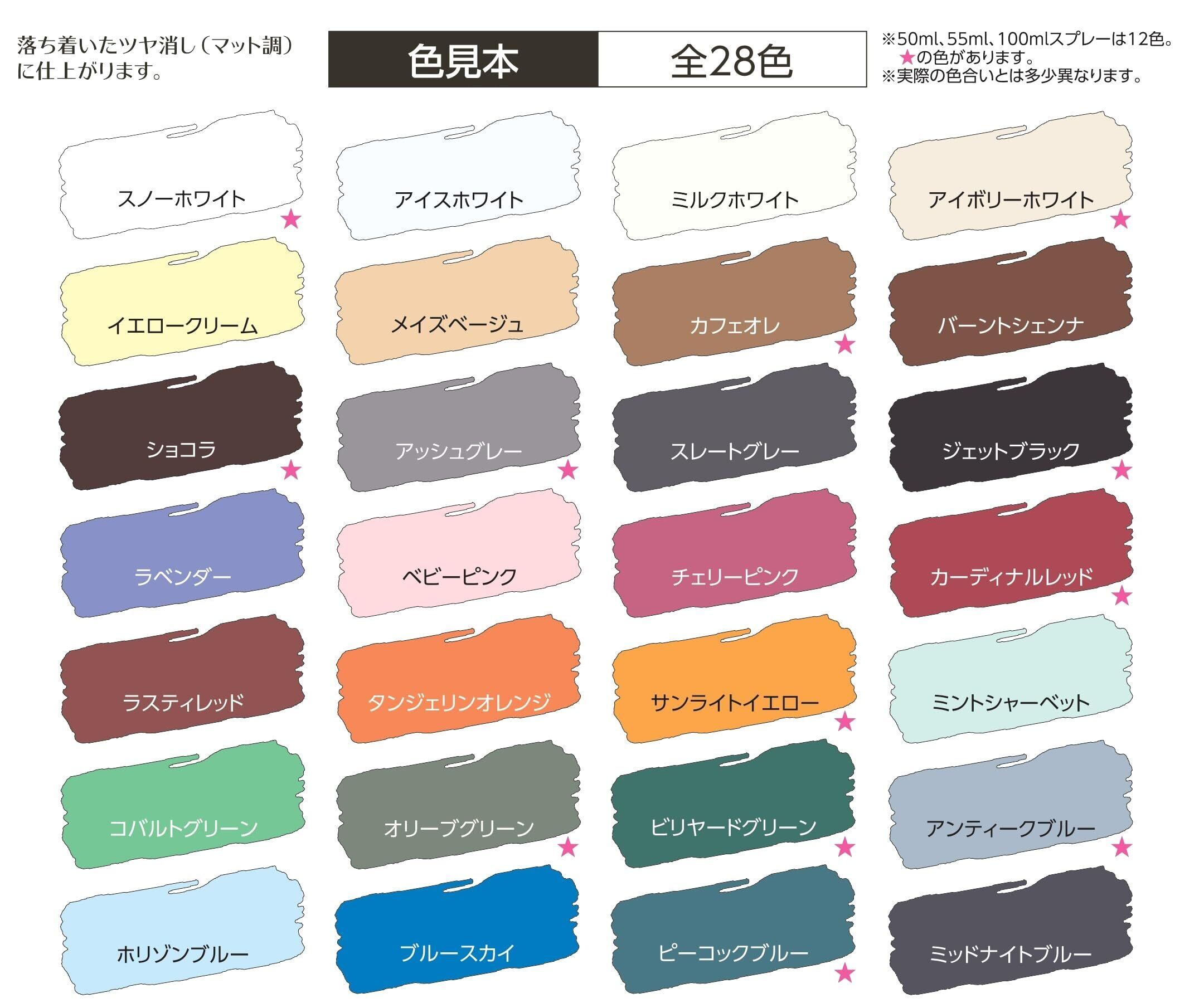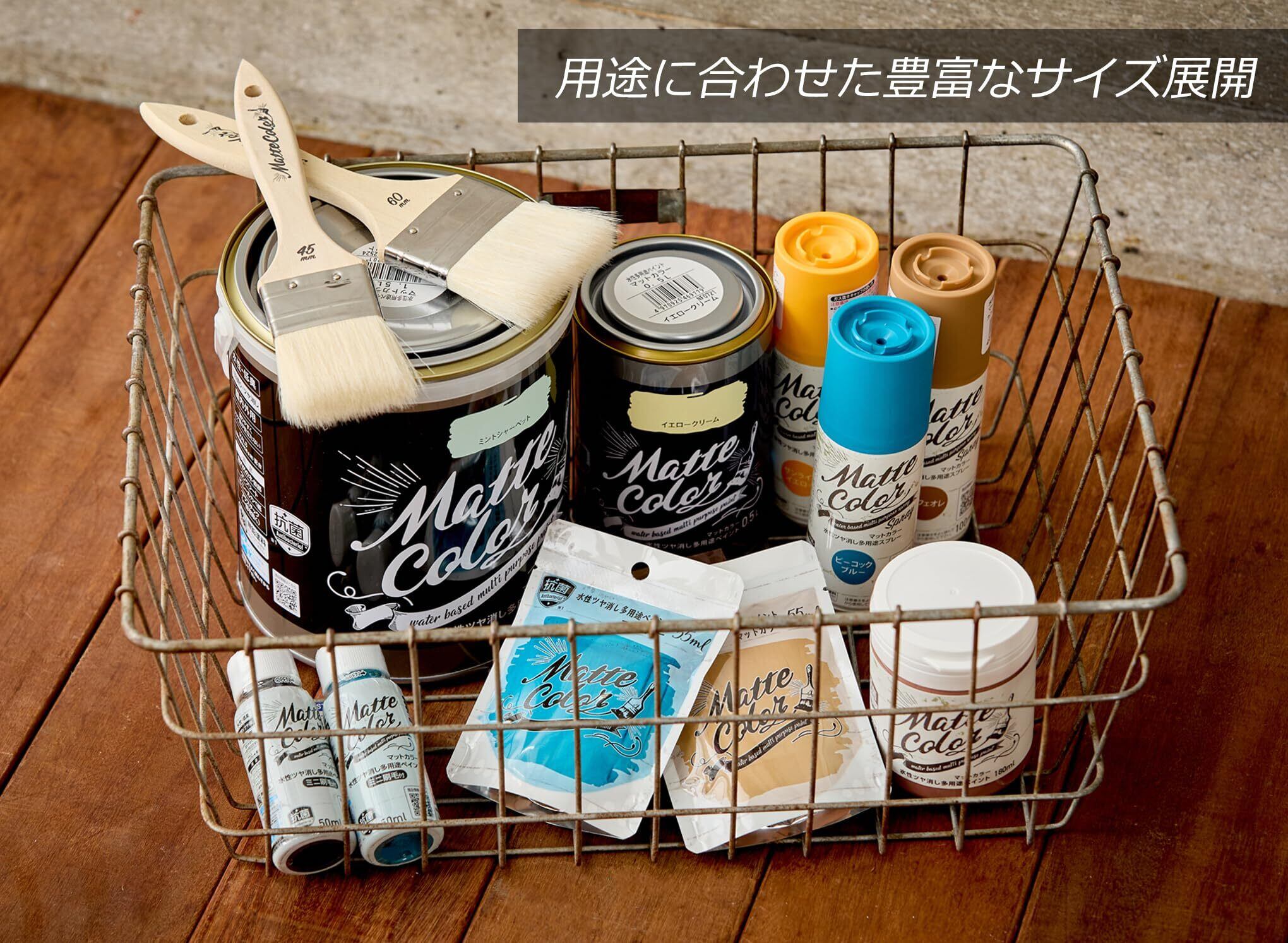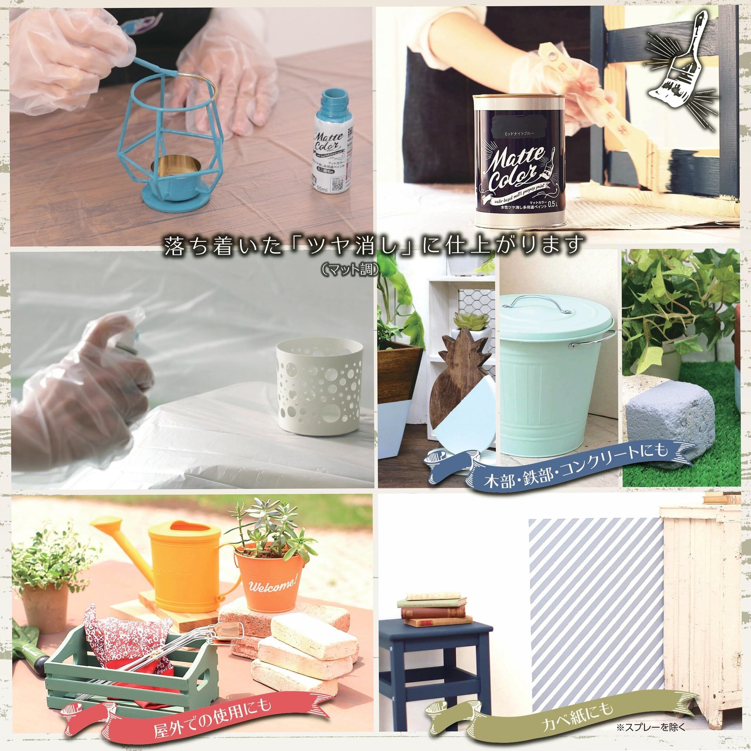 用途:(屋内外区分:屋内外用)ドア・板べい・ガーデン用品などの木部、家具・木工品などの木製品屋内外のコンクリート、スレート・ブロックなどの外カベフェンス・門扉・鉄柵・看板・おもちゃなどの鉄部・鉄製品室内カベ(カベ紙・ビニールカベ紙)発泡スチロール・アクリル・硬質塩ビのプラスチック面(他のプラスチック面には適しません)※化粧合板、床面、テーブルの天面、絶えず水がかかったり、いつも湿っているところには適しません。