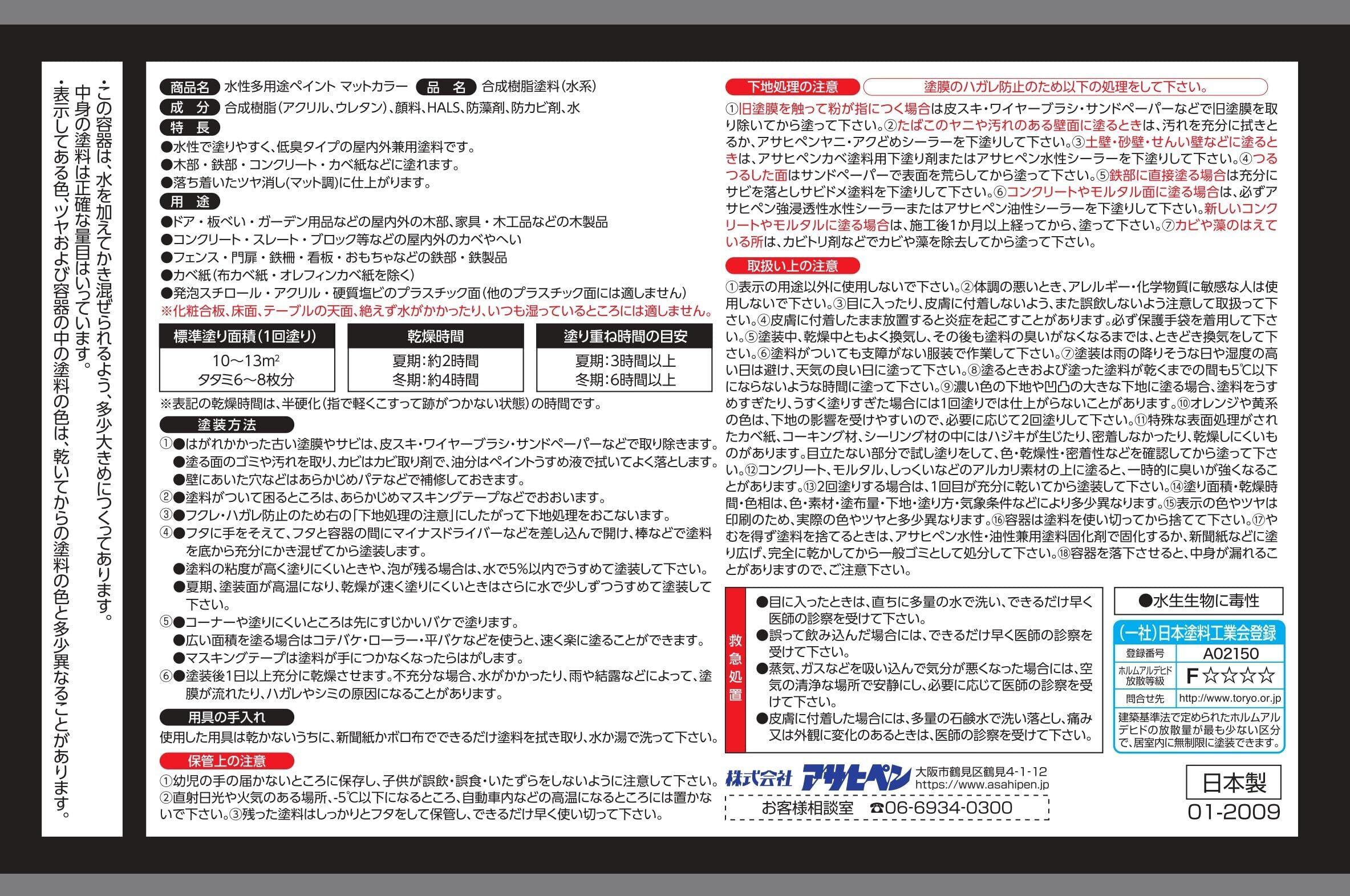 注意事項:●表示の用途以外に使用しないで下さい。 ●体調の悪いとき、アレルギー・化学物質に敏感な人は使用しないで下さい。 ●目に入ったり、皮膚に付着しないよう、また誤飲しないよう注意して取扱って下さい。 ●皮膚に付着したまま放置すると炎症を起こすことがあります。必ず保護手袋を着用して下さい。 ●塗装中、乾燥中とも換気をよくし、その後も塗料の臭いがなくなるまでは、ときどき換気をして下さい。 ●塗料がついても支障がない服装で作業して下さい。 ●塗装は雨の降りそうな日や湿度の高い日は避け、天気の良い日に塗って下さい。 ●塗るときおよび塗った塗料が乾くまでの間も5℃以下にならないような時間に塗って下さい。 ●濃い色の下地や凹凸の大きな下地に塗る場合、塗料をうすめすぎたり、うすく塗りすぎた場合には1回塗りでは仕上がらないことがあります。 ●オレンジや黄系の色は、下地の影響を受けやすいので、必要に応じて2回塗りして下さい。 ●特殊な表面処理がされたカベ紙、コーキング材、シーリング材の中にはハジキが生じたり、密着しなかったり、乾燥しにくいいものがあります。目立たない部分で試し塗りをして、色・乾燥性・密着性などを確認してから塗って下さい。 ●コンクリート、モルタル、しっくいなどのアルカリ素材の上に塗ると、一時的に臭いが強くなることがあります。 ●2回塗りする場合は、1回目が充分に乾いてから塗装して下さい。 ●塗り面積・乾燥時間・色相は、色・素材・塗布量・下地・塗り方・気象条件などにより多少異なります。 ●表示の色やツヤは印刷のため、実際の色やツヤと多少異なります。 ●容器は塗料を使い切ってから捨てて下さい。 ●やむを得ず塗料を捨てるときは、アサヒペン水性・油性兼用塗料固化剤で固化するか、新聞紙などに塗り広げ、完全に乾かしてから一般ゴミとして処分して下さい。 ●容器を落下させると、中身が漏れることがありますので、ご注意下さい。