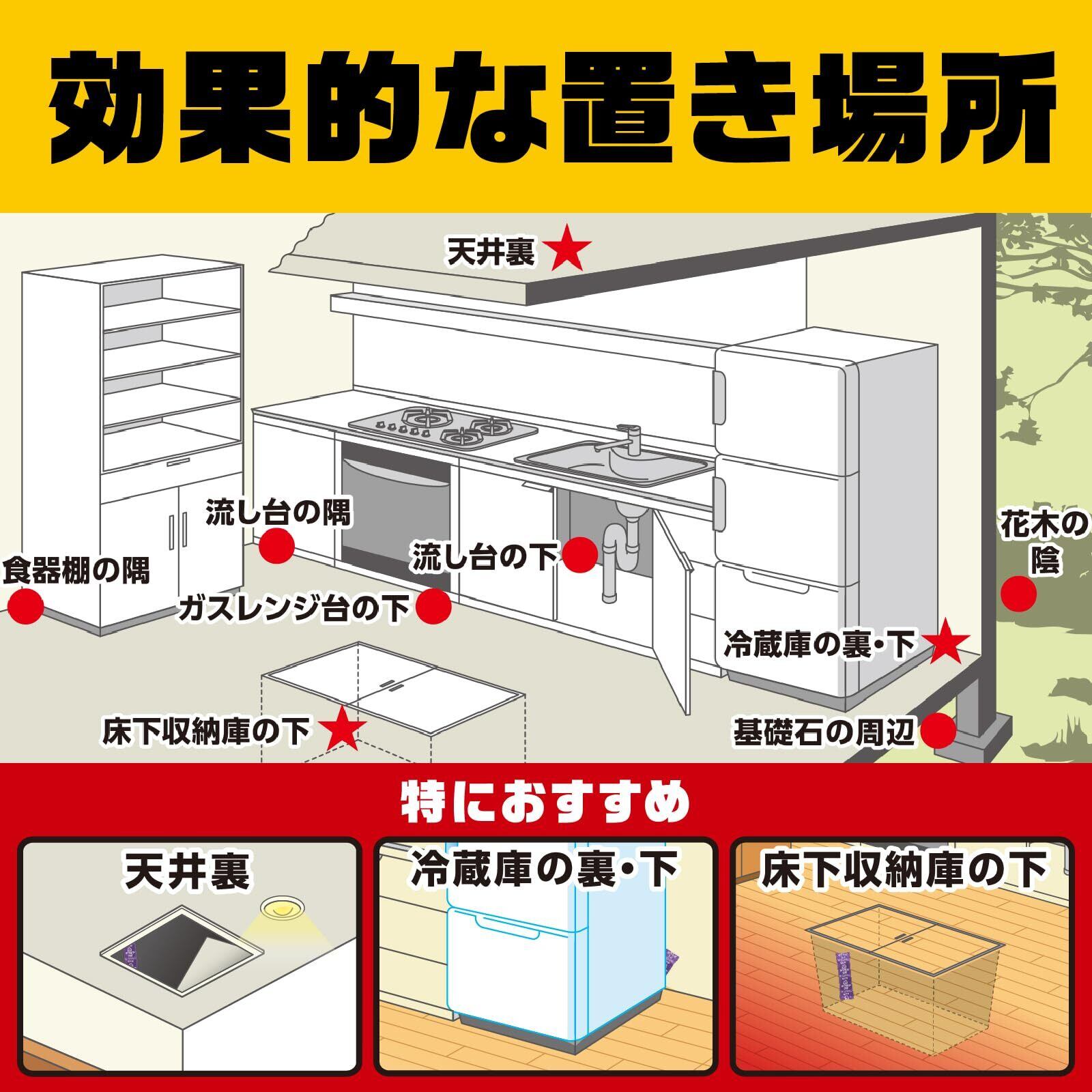 【おすすめの使用場所】天井裏、冷蔵庫の裏・下、床下収納庫の下、流し台の下・隅、食器棚の隅、ガスレンジ台の下、基礎石の周辺、花木の陰