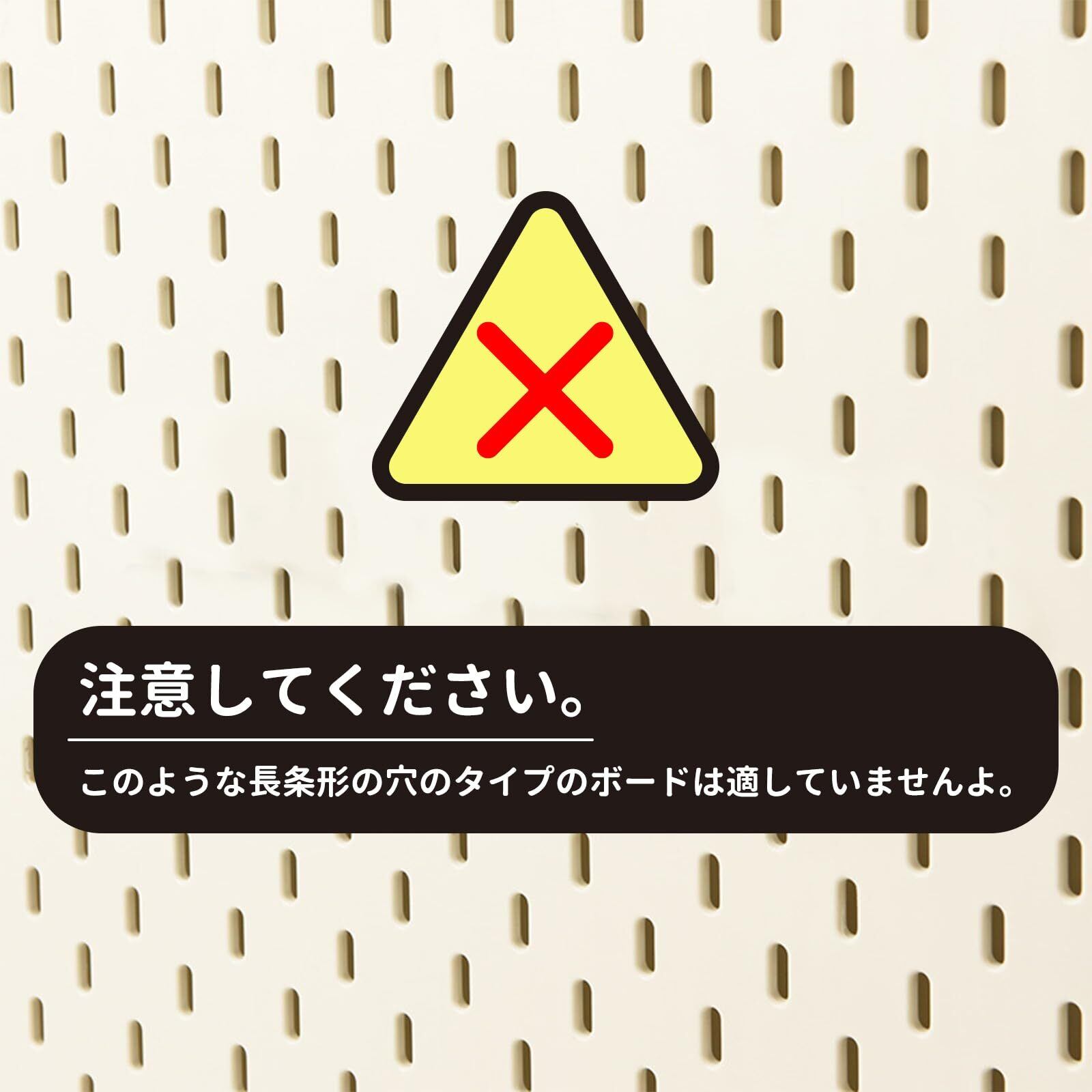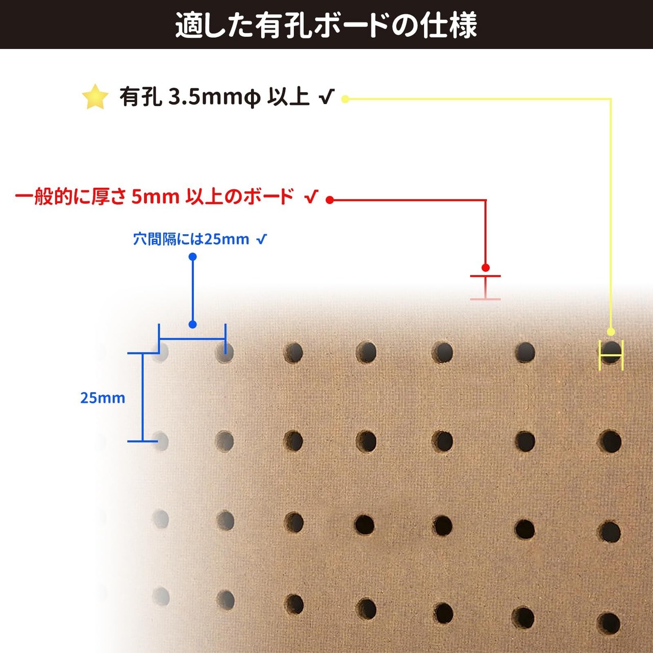注意:長穴ペグボードには適さなく、丸穴直径3.9mm以上のみ適用です。