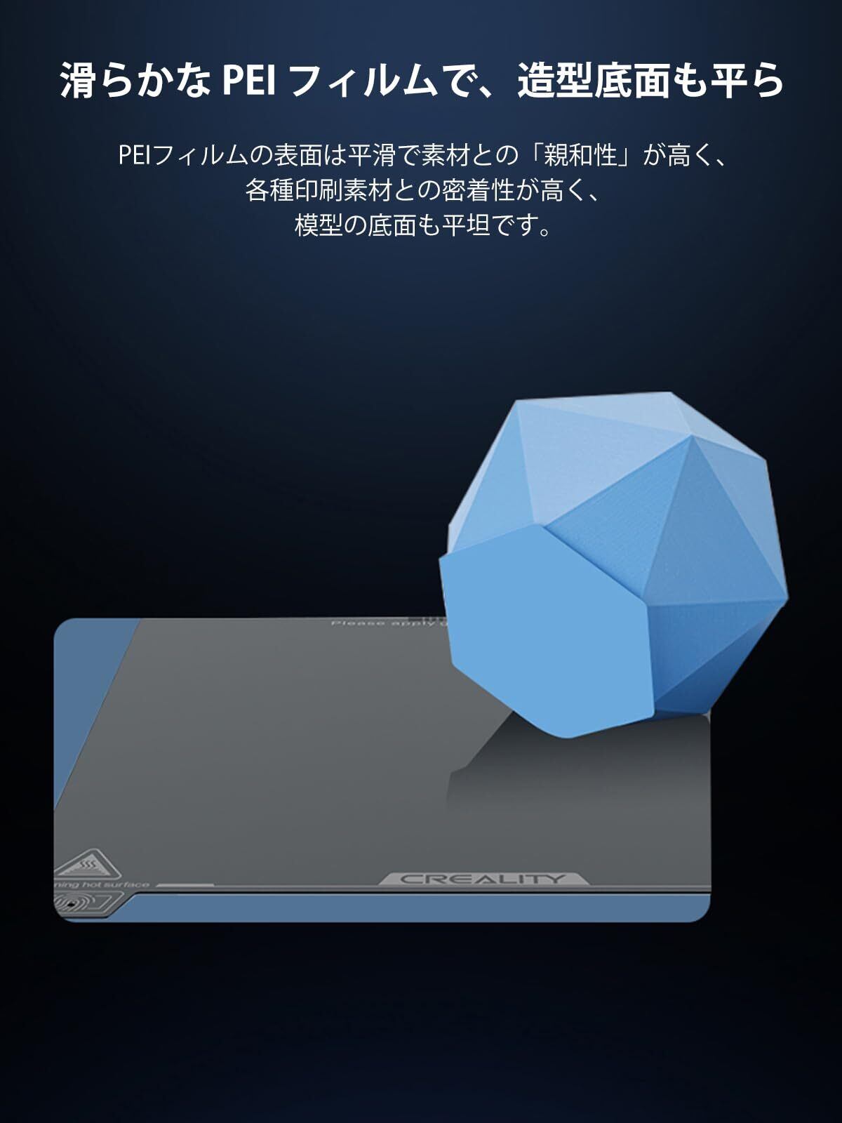 高強度と耐摩耗性:PEIコーティングは耐摩耗性と高温耐久性が特徴です。傷がつきにくく、様々な印刷材料に幅広く適用できます。高温でも低温でも印刷物に確実な接着力を与え、接着剤を追加する必要がなく、反りのない安定した3D印刷をし、印刷の成功率を大幅に向上させます。