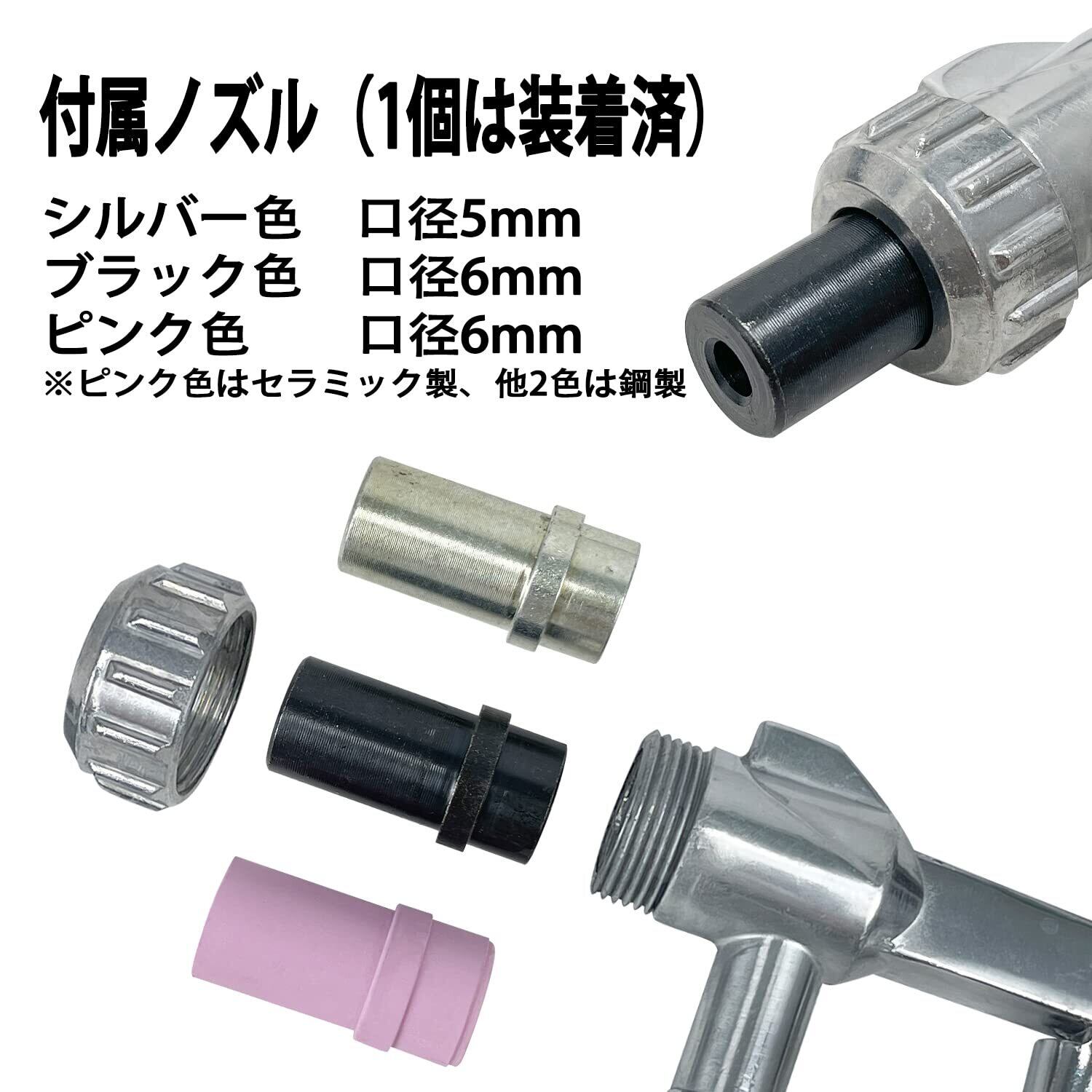 ノズルが3個付き(黒い鋼製口径6mm*1 ピンクセラミック製口径6mm*1 シルバー鋼製口径5mm*1)。様々な用途には利用できます。ノズルは指で簡単に交換可能。金属製の吸引ヘッドで、変形にくく長持ち。長さ104cm、内径15mmのホースなので、砂を均等に吸い上げて、詰まりにくくなります。スムーズに作業可能。