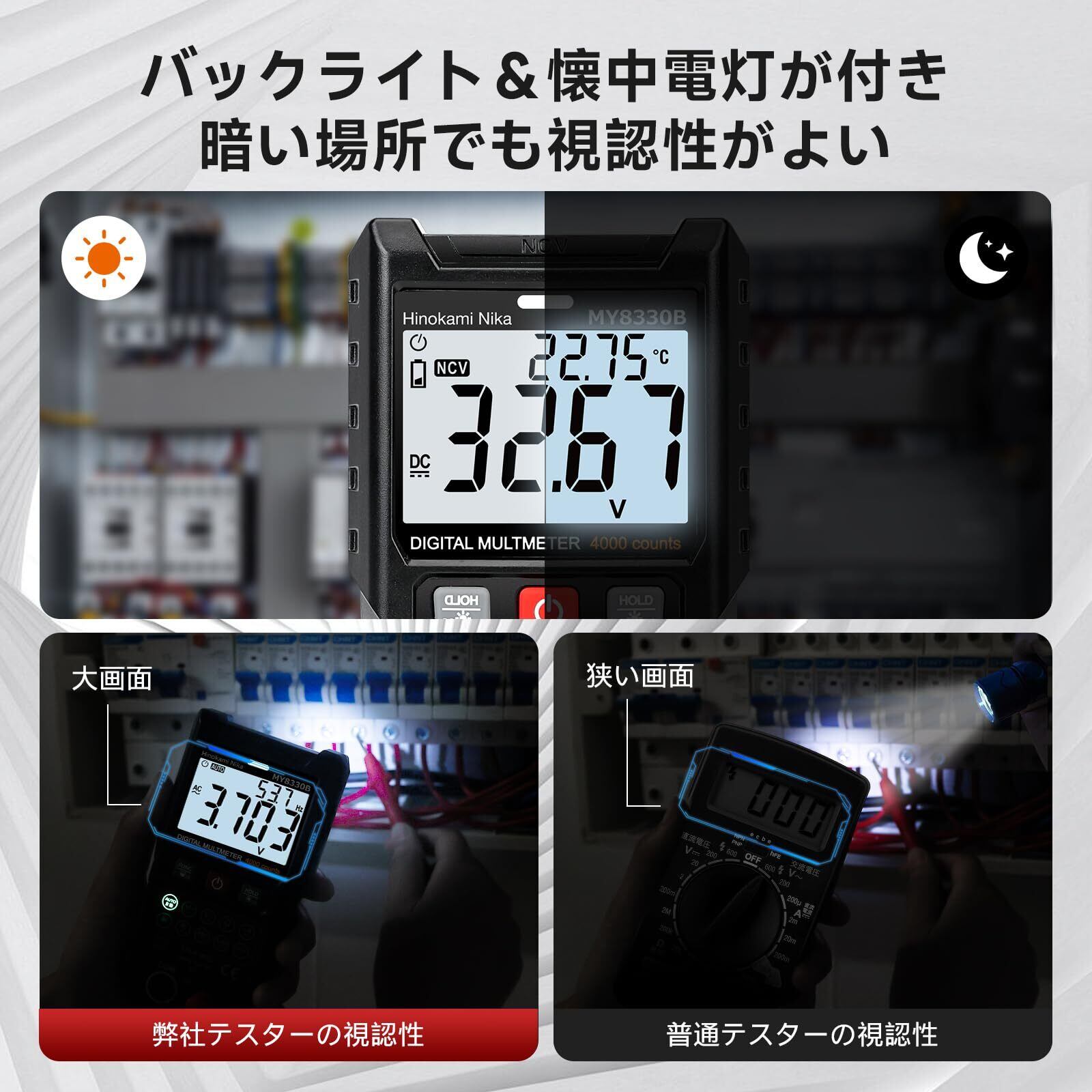 【2022最新】Hinokami Nika 2024新型MY8330B テスター デジタル オート/マニュアル二重モード、市販唯一機能インジケーター付き超軽量マルチメーター 4000カウント スマートオートレンジ、小型デジタルテスター 静電容量、導通ブザー付き検電テスター 車、AC/DC電圧テスター 周波数 非接触電圧検知機能 温度表示 抵抗 ダイオード 連続性 TRMS 懐中電灯 3年
