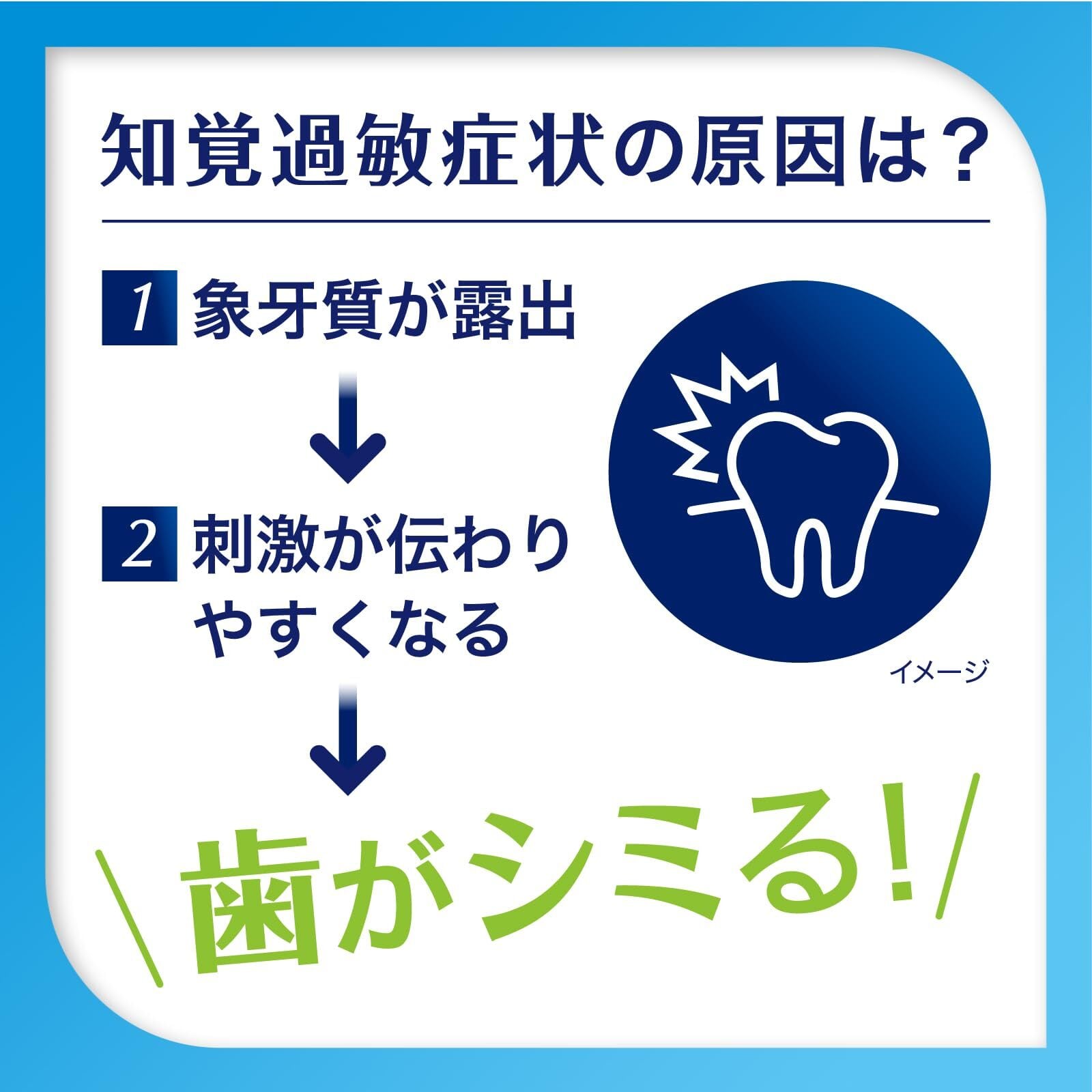 硝酸カリウムが、カリウムイオンとなって歯髄神経のまわりにイオンバリアを形成し、不快感や痛みを防ぎます。