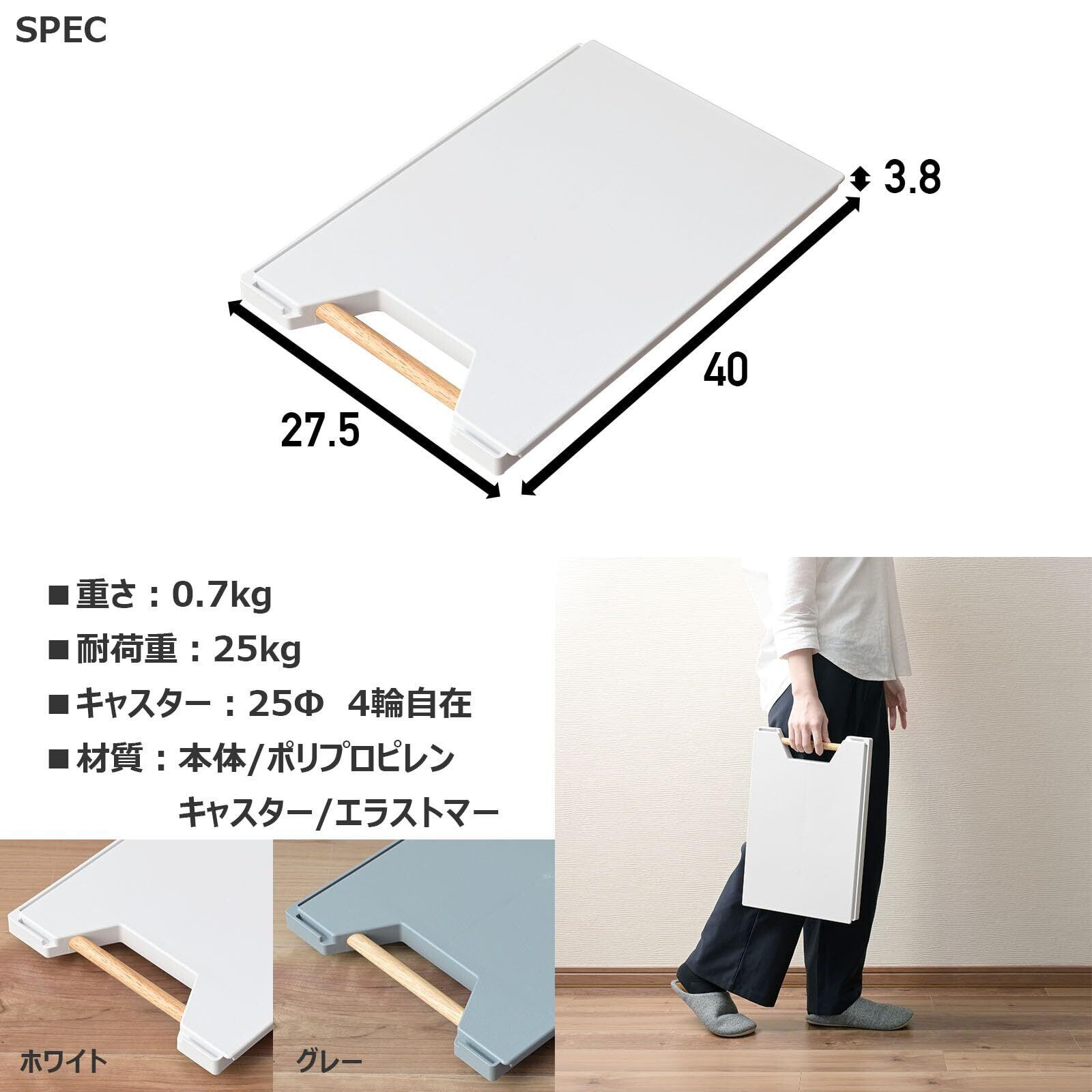 高さ3.8cmと超薄型で圧迫感が少なく、キャスターが目立ちにくく、さらに木製取っ手がインテリアに馴染みやすい、家庭用の平台車です。使わない時は家具のすき間・下などに収納できて場所を取りません。取っ手が付いているので引きだしやすくなっています。