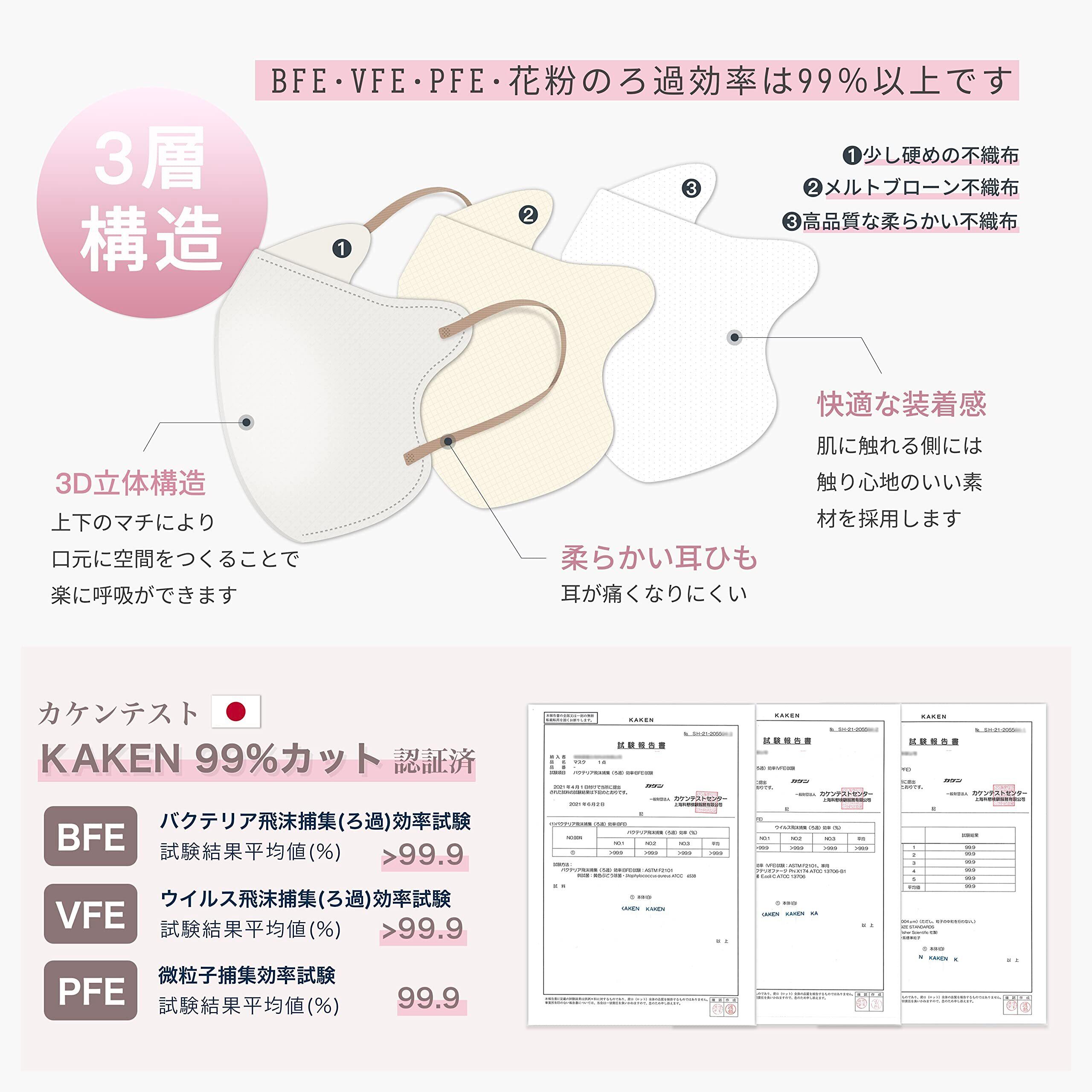【3d小顔立体マスク】人体工学に基づいた3D立体構造設計で、「リップが付きにくい」「呼吸がしやすい」「小顔効果がある」と大好評いただいているおしゃれマスクです。最上級のES繊維素材を使用して、BFE・VFE・PFE 99%以上です