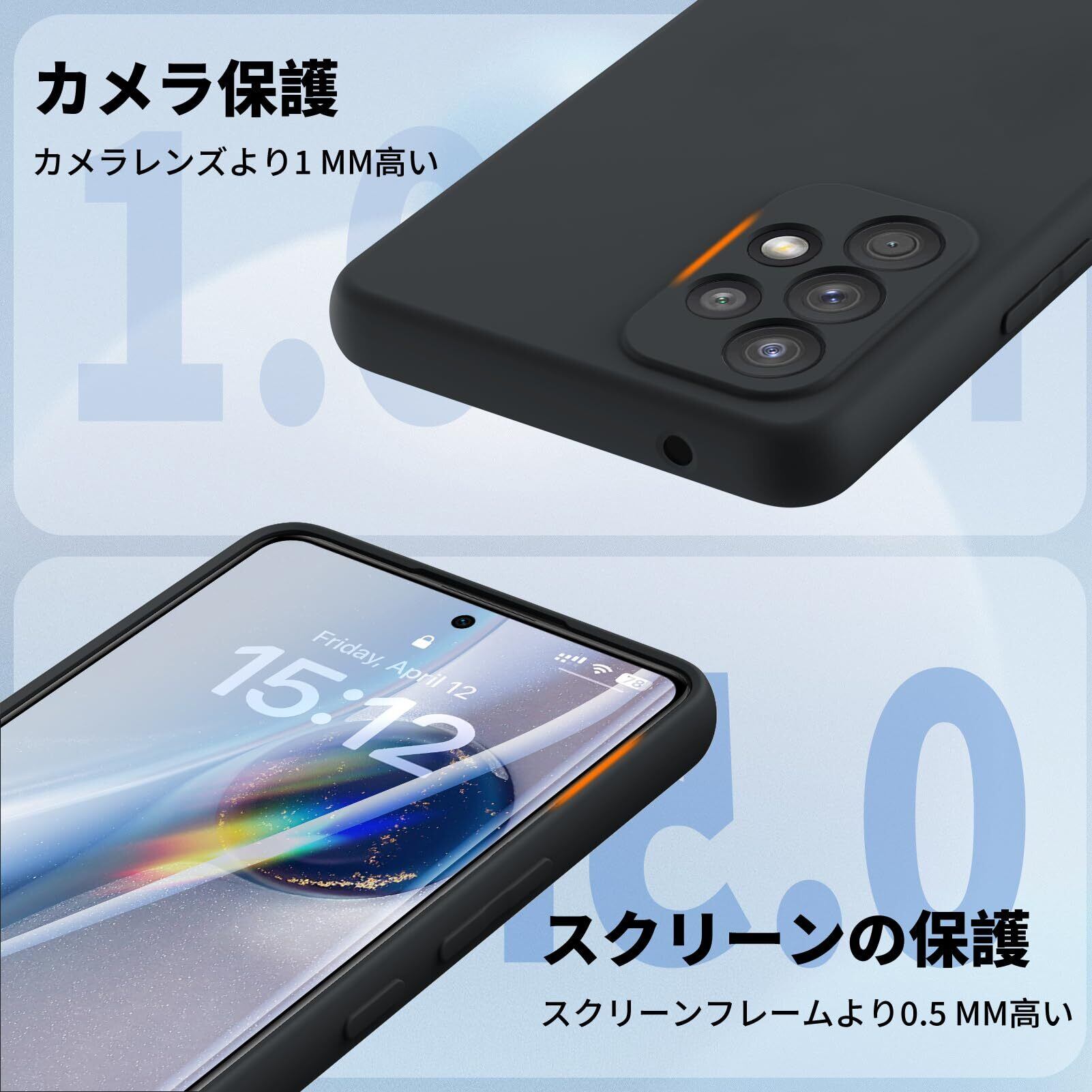 【レンズまで全面保護】本体に従って高低差設計、液晶画面より1mm高め。カメラレンズより0.5mm高め、外部と接触せず傷付く心配はない。更に、背面サイドでは少し高めがあり、滑り止め機能が備わって、ケース背面までも傷から保護でき、いつもキレイに保ちます。四隅が衝撃を効果的に吸収するので、衝撃を最小限に抑えます。