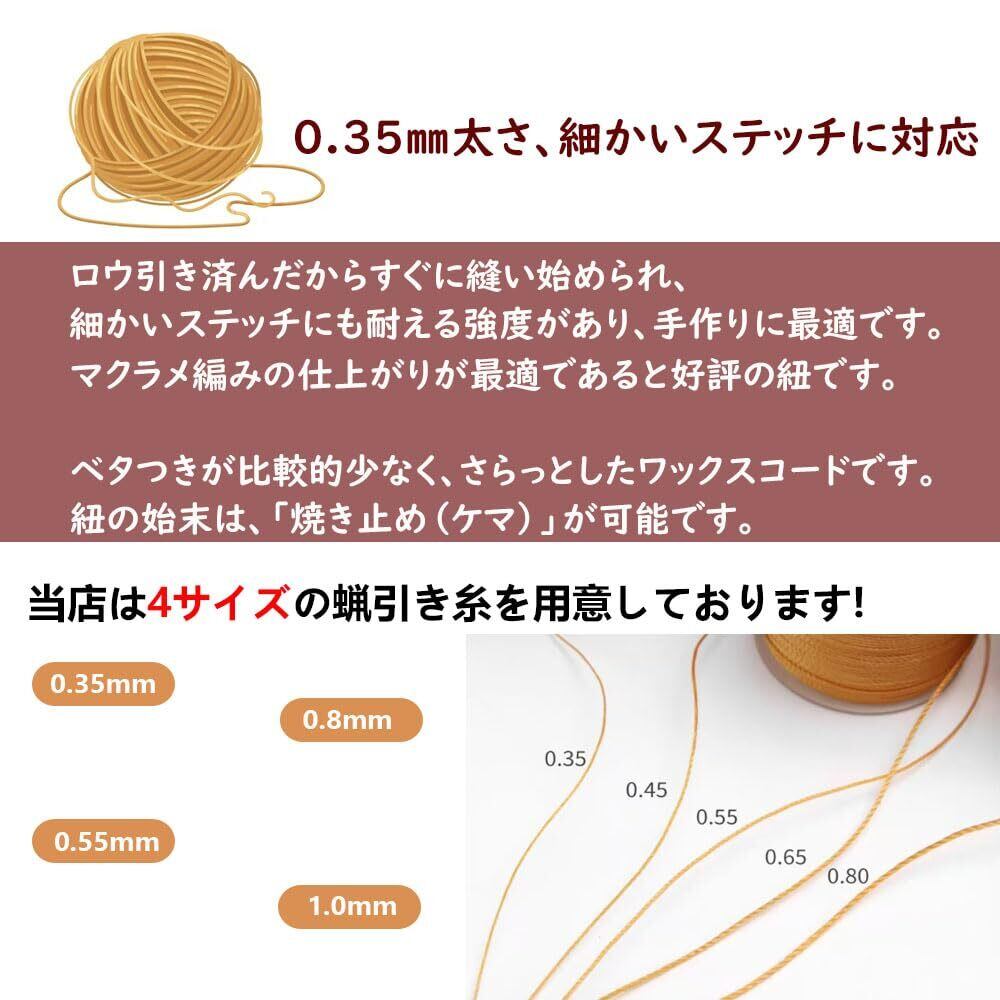 【極細ワックスコード】 ポリエステルろうびき糸、太さ0.35㎜、1㎜と2㎜菱目打ちと相性よく、通しやすく丸紐タイプでステッチも綺麗で立体的。レザークラフト手縫いに最適だけではなく、マクラメに活躍できます。