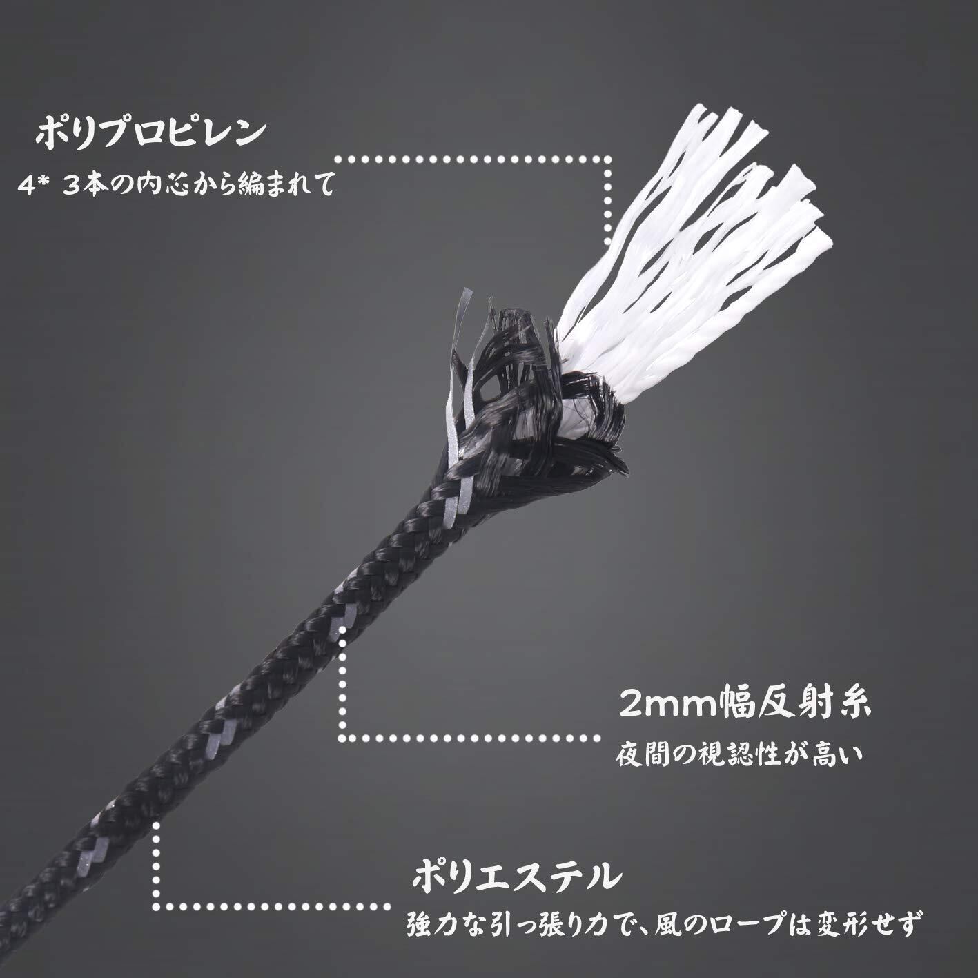 高品質:ガイロープは高品質の耐久性に優れた材質で作られています。強度と防水性能を高めるためロープは14本の外芯(黄色の部分)+ 3* 4本の内芯(内部白い部分)から編まれています。強力な引っ張り力で、風のロープは変形せず、効果的に力を伝達することができます