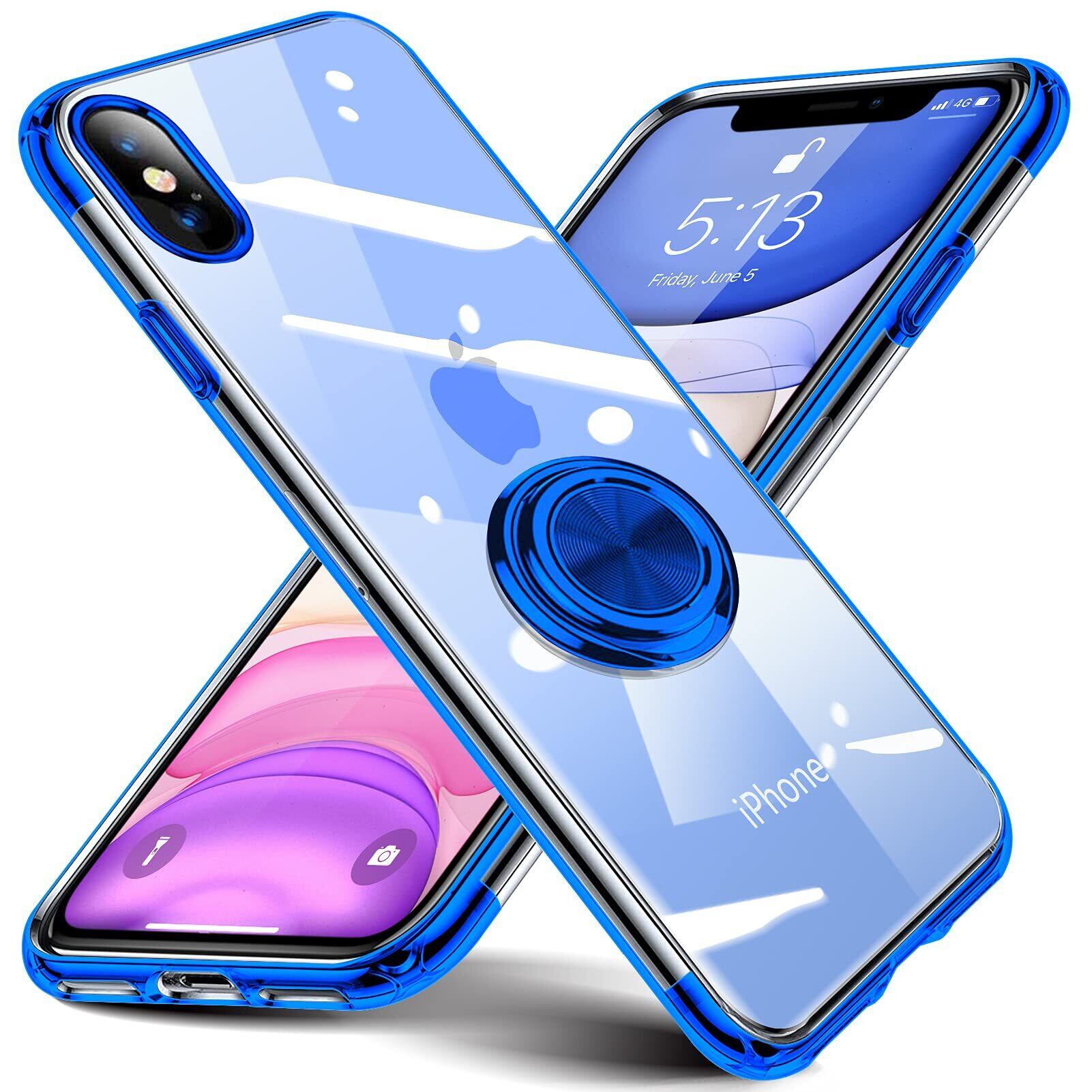 iPhone XS 用 ケース iPhone X 用 ケース リング付き クリア アイフォン XS/X クリア ケース リング付き ケース 透明 柔軟 TPU 耐衝撃 車載ホルダー対応 米軍MIL規格 ストラップホール付き 薄型 軽量 擦り傷防止 保護カバー 耐久 スリム アイフォン XS/X カバー(クリア·青)R63-XS-QIN-01
