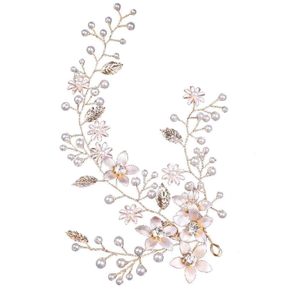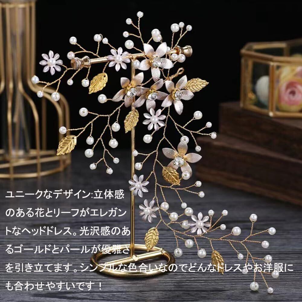 【ユニークなデザイン】立体感のある花とリーフがエレガントなヘッドドレス。光沢感のあるゴールドとパールが優雅さを引き立てます。シンプルな色合いなのでどんなドレスやお洋服にも合わせやすいです!
