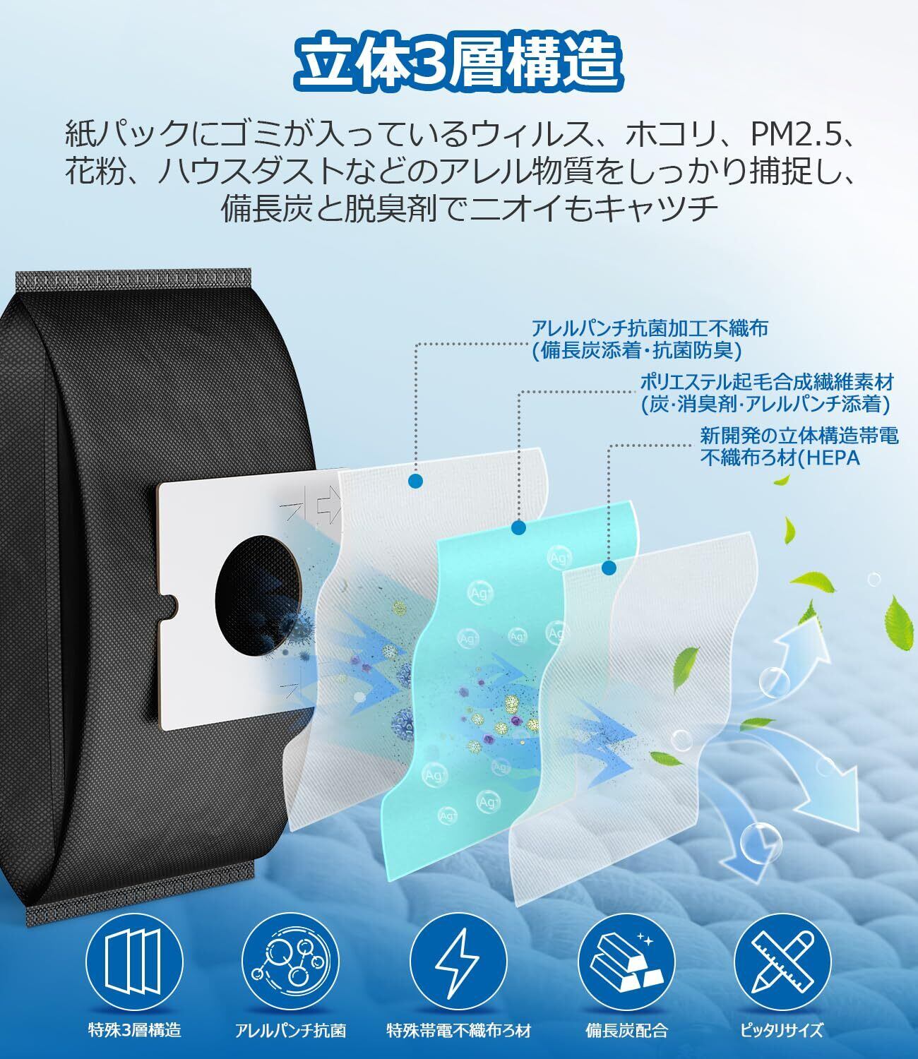 【抗菌紙パック】ゴミに潜む細菌、ウィルス、花粉、ダニなどの粒径0.1μm以下の超微小粒子状物質も99.99%をしっかり集めます。
