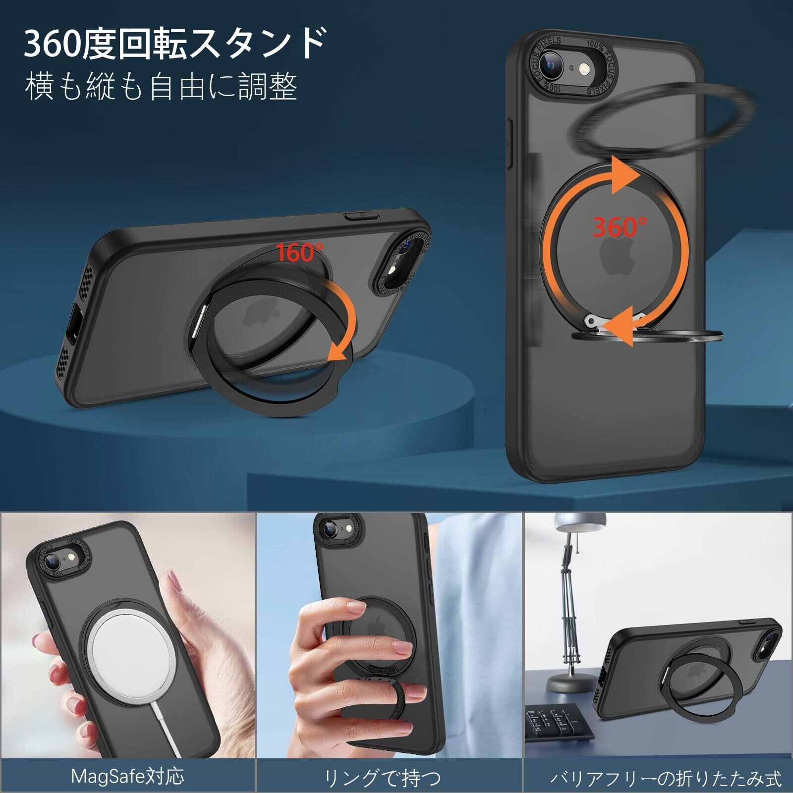 DOMAVER iPhone SE ケース 第3世代 第2世代 iPhone 8 ケース iPhone 7 ケース ワイヤレス対応 360°回転スタンド 耐衝撃 滑り止め 指紋防止 米軍MIL規格 マット仕上げ 半透明 傷に強い背面 滑り止め 黄ばみなし 画面レンズ保護 アイフォン SE3 SE2 7 8 用カバー 4.7インチ ブラック