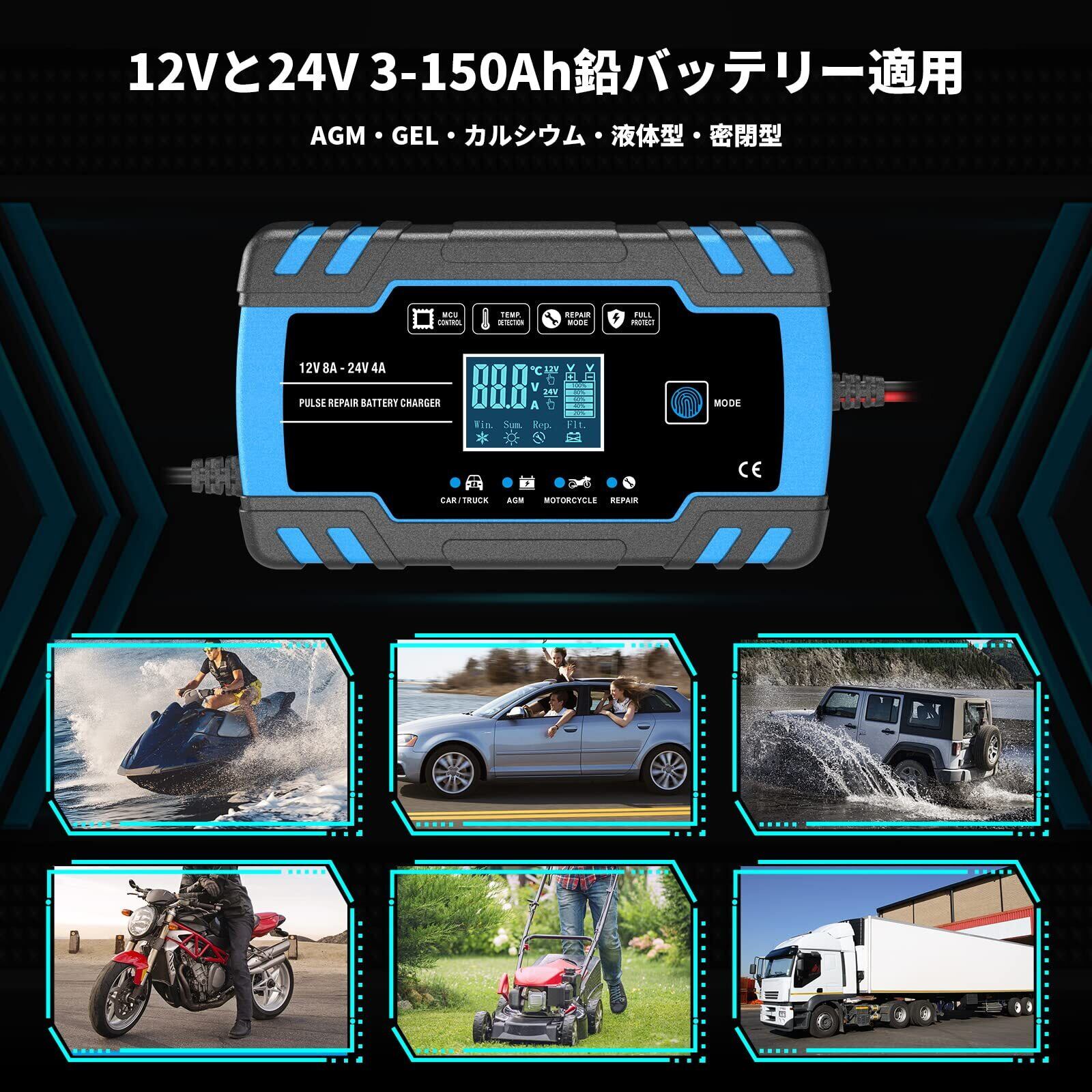 AUTOWHD 12Vと24V用鉛蓄バッテリー充電器 全自動バッテリーチャージャー 修復充電機 パルス充電 1.5A/4A/8A充電電流 トリクル充電 3-150Ah用LCD表示 自動車&バイク&トラック等適用 日本語説明書