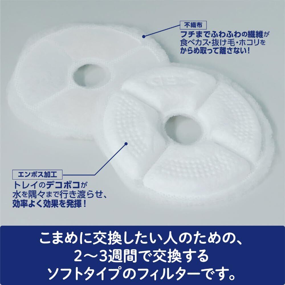 ●イオニック(イオン交換樹脂):水道水のマグネシウム、カルシウムを除去してペットにやさしい軟水に。 ●活性炭(抗菌活性炭配合):カルキ臭を吸着しおいしい水に。 ●不織布:フチまでふわふわの繊維が食べカス・抜け毛・ホコリをからめとって離さない! ●エンボス加工:トレイの凸凹が水を隅々までいきわたらせ、効率よく効果を発揮!