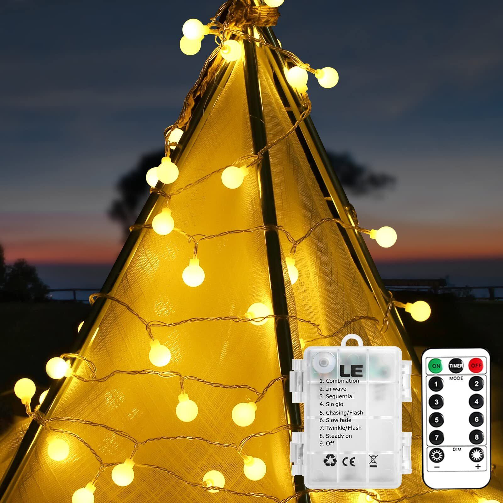 Lighting EVER イルミネーションライト led ガーランドライト キャンプライト 電池式 デコレーションライト フェアリーライト 8種点灯モード led電飾 5m 50球 電球色 防水 調光可能 【リモコンと電池ボックス 2WAYコントロール/8種類の点灯モード/明るさ無段階調整/タイム設定】 装飾 飾り付け キャンプサイト ポーチ デッキ アウトドア 庭 屋外