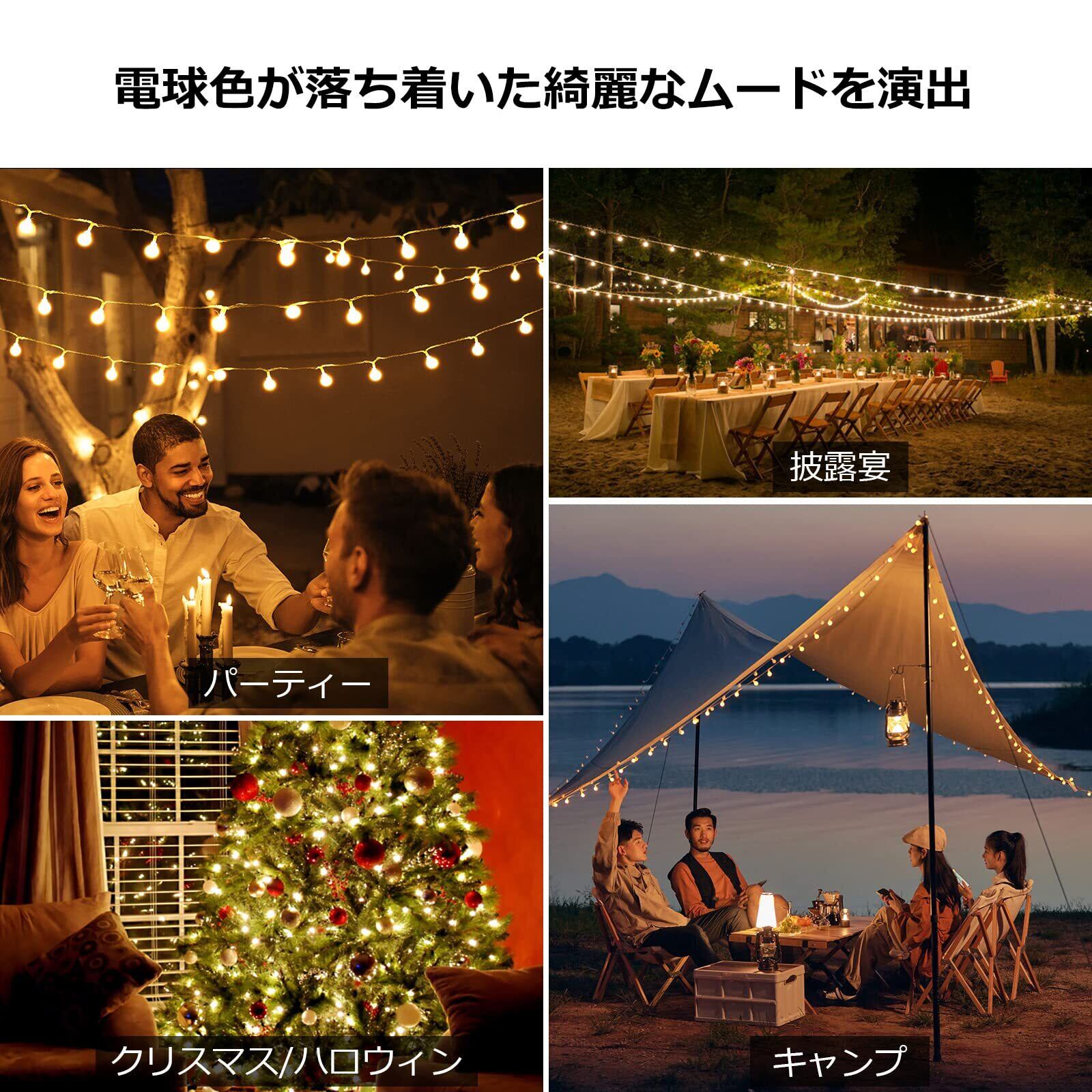 【電池式・持ち運び便利】やさしい電球色の電球が5M内50個配備され、幅広くデコレーション頂けます。割れない硬質プラ電球で、安心して持ち運びもできます。単3電池(別売り)3本で使用出来ますので、給電と配線の心配もなく、どこでもお好きな所に装着可能。ぜひあなたのキャンプライフのワンプラスにお試しください