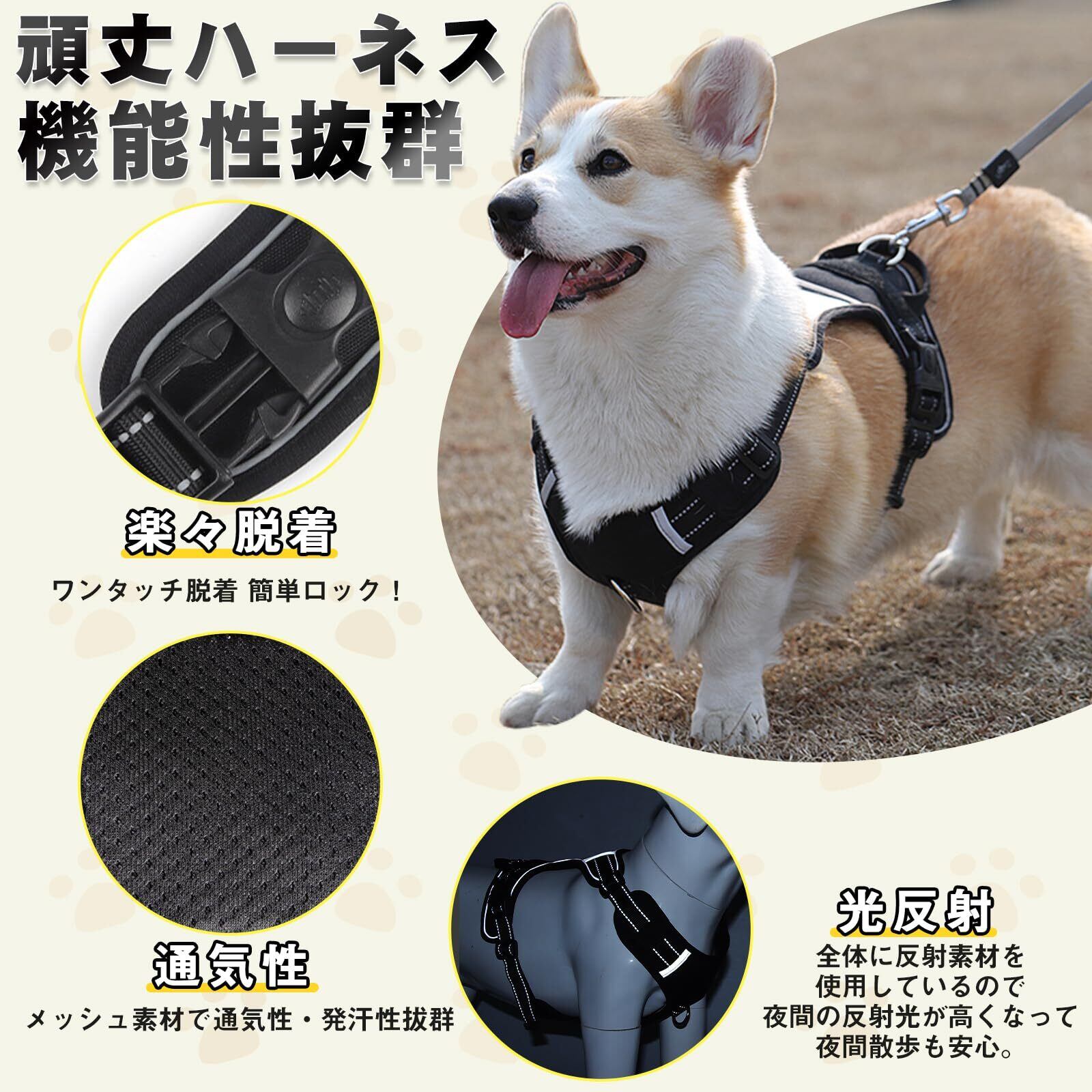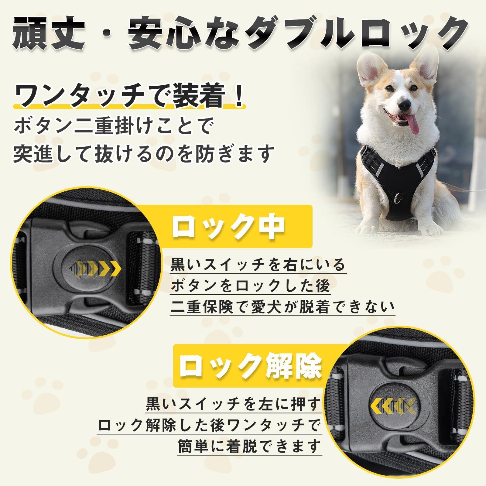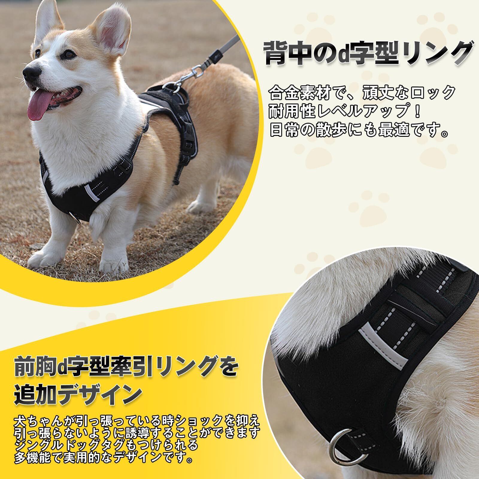 【高品質素材・リート付き】抜けないハーネスは高品質なナイロンのオックスフォード素材で作られたメッシュはーねす、頑丈で耐久性がありながら、柔らかく通気性があり快適です。 首と胸に一つDリングが付いており、前胸の新追加の金属リングはリードロープの他、ブランドや鈴などのアクセサリーも取り付け可能です。 付きのリートを胸前のDリングに引き紐を装着すれば、愛犬が引っ張ると自然に主人の方を向くため、すぐに引っ張りを止めてくれます。これにより、犬が引っ張る悪癖を軽減されることができます。