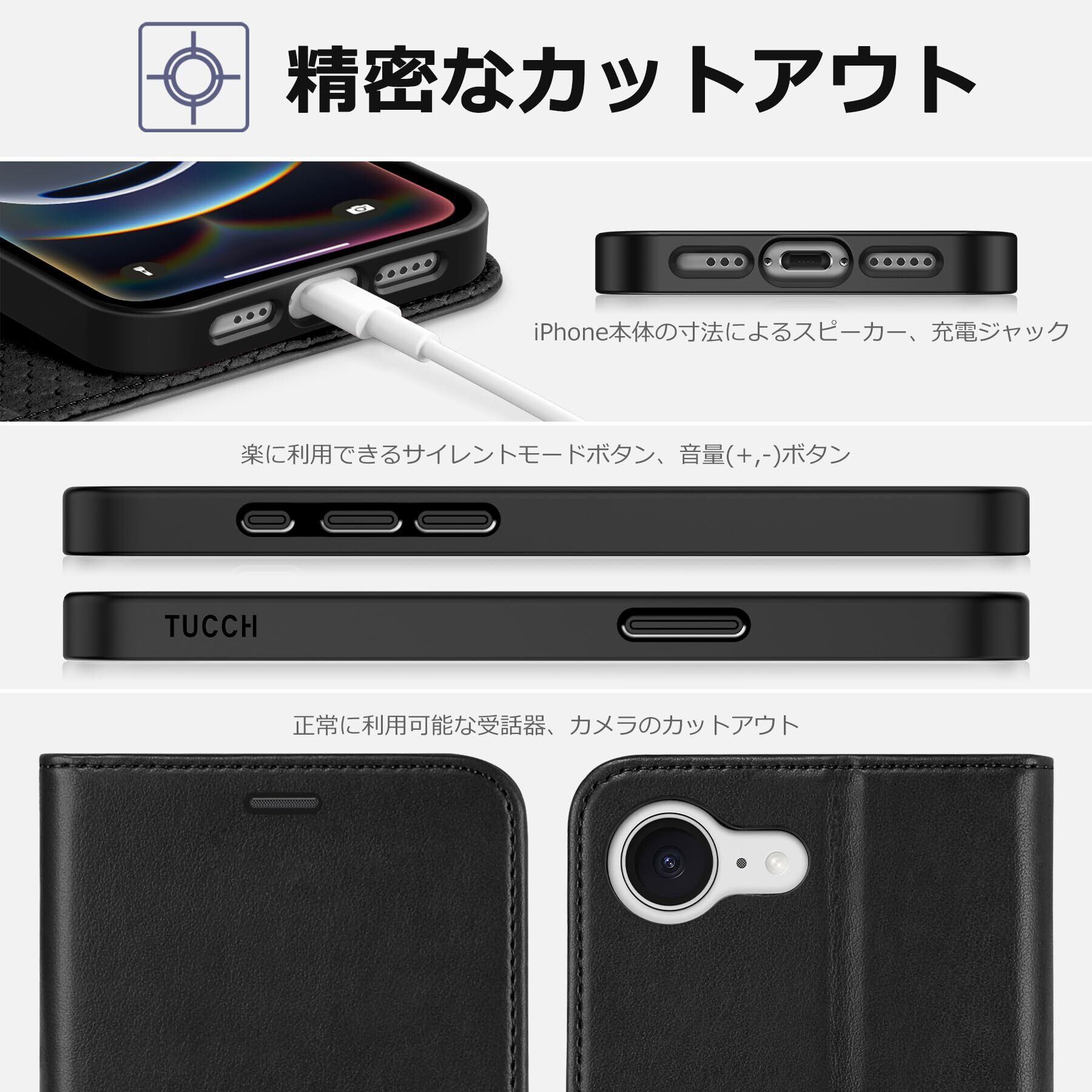 TUCCH iPhone 16e 対応 ケース 手帳型 アイフォン16e 手帳ケース カード収納 横置きスタンド機能 [RFIDブロッキング] 耐衝撃 全面保護 TPU素材 PU合皮 あいふぉん16eカバー (2025年発売 6.1インチ アイフォーン16e対応)ブラック