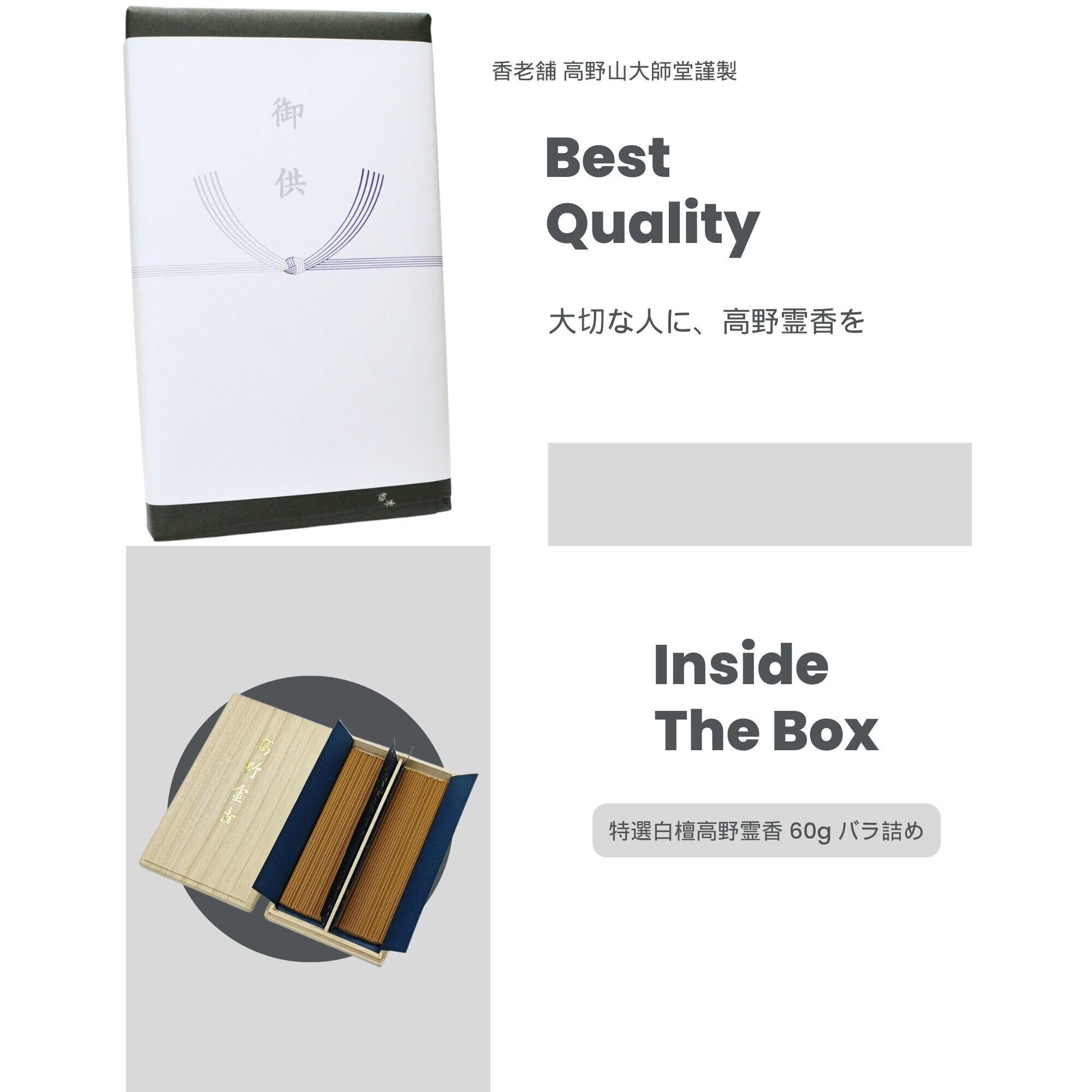 特選白檀高野霊香の桐箱ギフトセット: 高品質な特選白檀高野霊香を桐箱に収めた、体裁の良いギフトセットです。線香は使いやすいバラ詰めで、お手頃価格なので先方に気を使わせることなく贈ることができます。