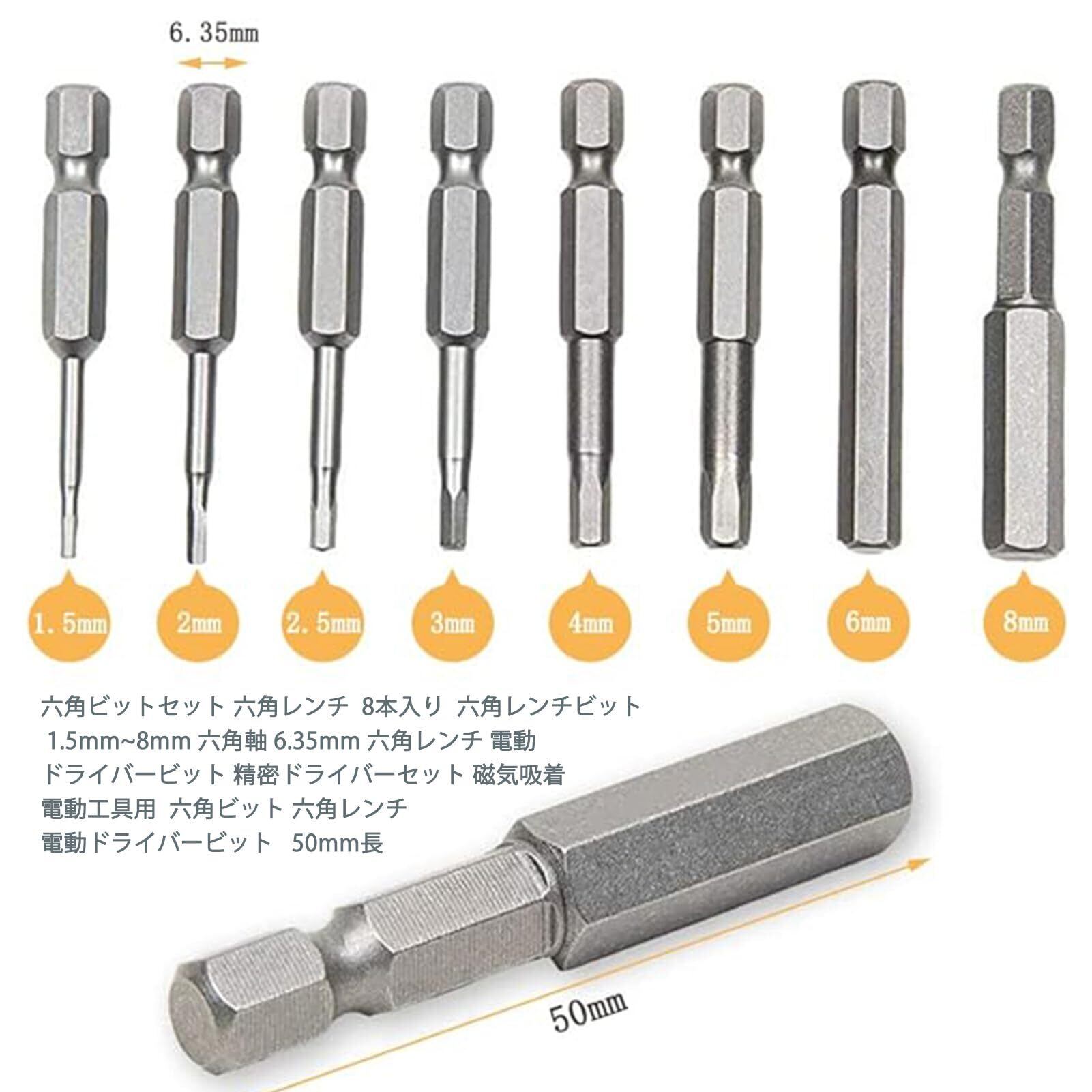 ZiSyouMa 六角ビットセット 8本セット 1.5mm~8mm 六角軸 6.35mm 六角レンチ 電動ドライバービット 精密ドライバーセット 磁気吸着 電動工具用 六角ビット 六角レンチ 電動ドライバービット 50mm長 8本入り