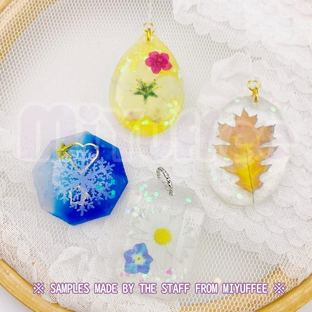 4個のシリコンモールドでパーツを合計26種も作れ、一部は通し穴付きで、ネックレスやピアスのペンダント、ストラップなどのオリジナルの作品を製作することができます。ジュエリー・宝石・丸・蝶々・ハート・フレームなど様々なアクセサリーパーツに最適です。