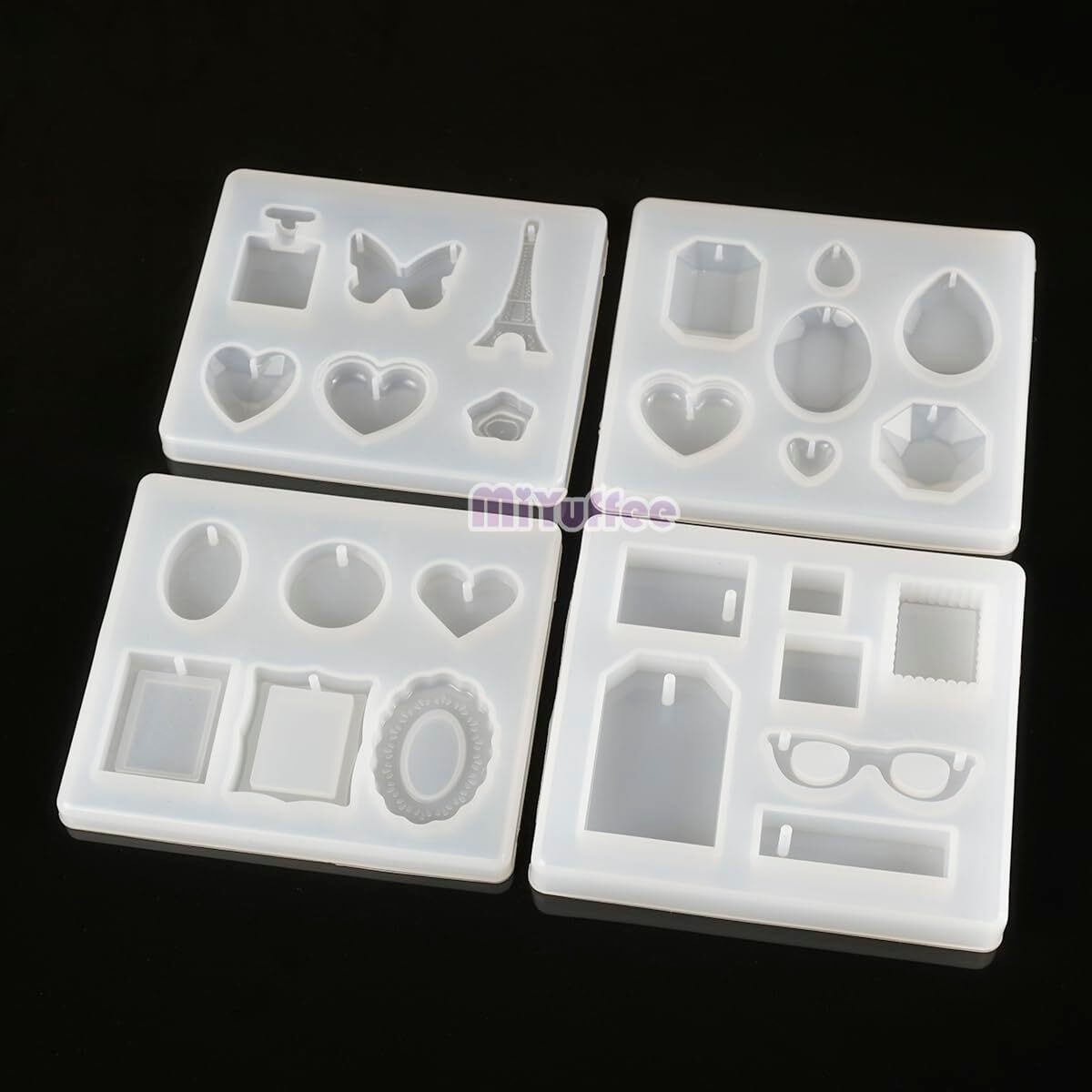 UVレジン、エポキシ樹脂、樹脂粘土などにご利用いただけるシリコンモールドです。ジュエリー・宝石・丸・ハート・フレーム・四角・タグ・メガネなど26種アクセサリーパーツの4個レジン型セットです。