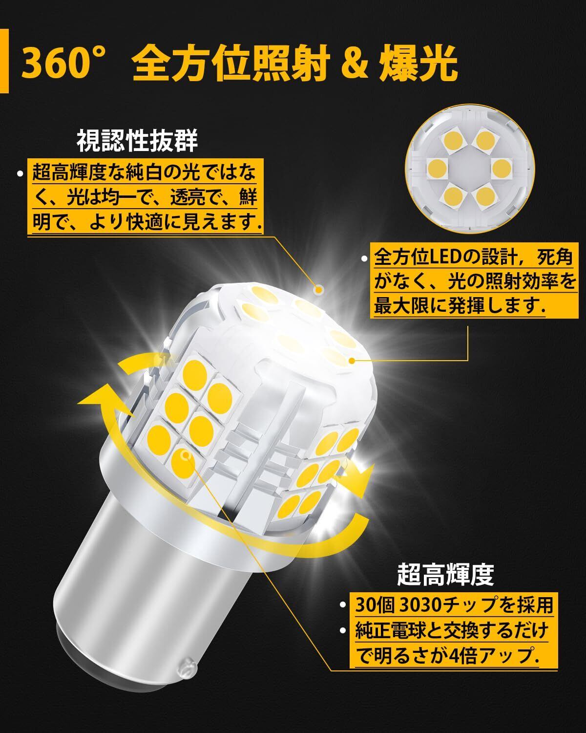 【超高輝度&長寿命】超高輝度1200LMの明るさ低電力消耗、最先端超高発光効率の3030LED素子30個搭載、360°全方位照射でき、12V車用S25 ダブル バルブ。原装ランプより4倍に明るいです. 6000K-6500K純白の光です. 省エネ、しかないです. 長持ちで、運行時間は50000時間以上です. 起動時、遅延の状況がないです。