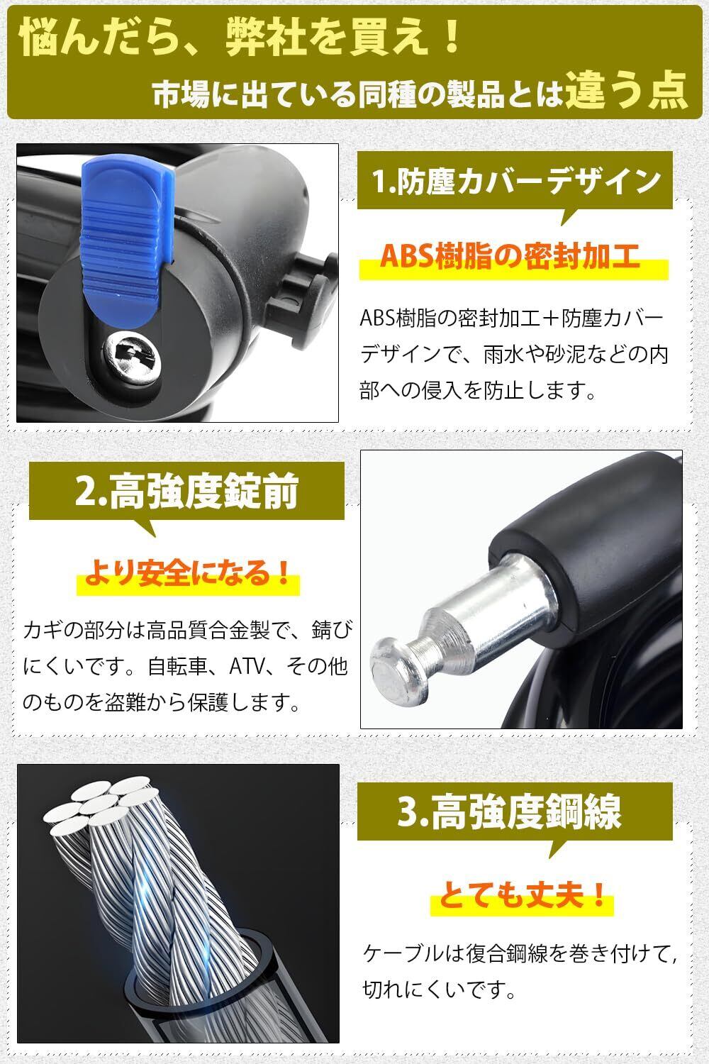 【防犯性能を追求した高切断耐性】特殊スチールワイヤーに独自の熱処理加工を施し、ボルトカッターやニッパーへの耐性を強化。第三者による不正切断を防ぐ防犯基準認証対応構造で、大切な乗り物をしっかりガード。