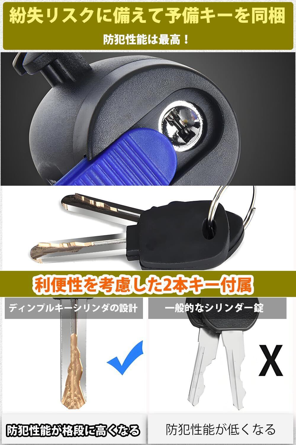 【利便性を考慮した2本キー付属】紛失リスクに備えて予備キーを同梱。シリンダー部には防錆加工を施し、スムーズな施錠/解錠が可能。鍵穴形状を複雑化することでピッキング防止にも配慮しています。新たにアップグレードされたディンプルキーシリンダは、従来の普通鍵よりも防犯性能が格段に向上しています。