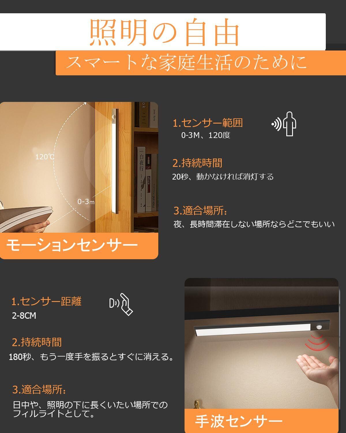 【モーションセンサーと手波センサー】人感センサーライトには2種類のセンサーがあります。AUTO(自動)モードで、3m/120°の範囲内の運動が検出されると自動的にオンになります。約20秒以内に何の動作も検出されないと、キャビネットライトがオフになります。手波センサーを起動した場合、持続時間は180秒、2-8CMの距離で手を振るだけで簡単にオン/オフにします。