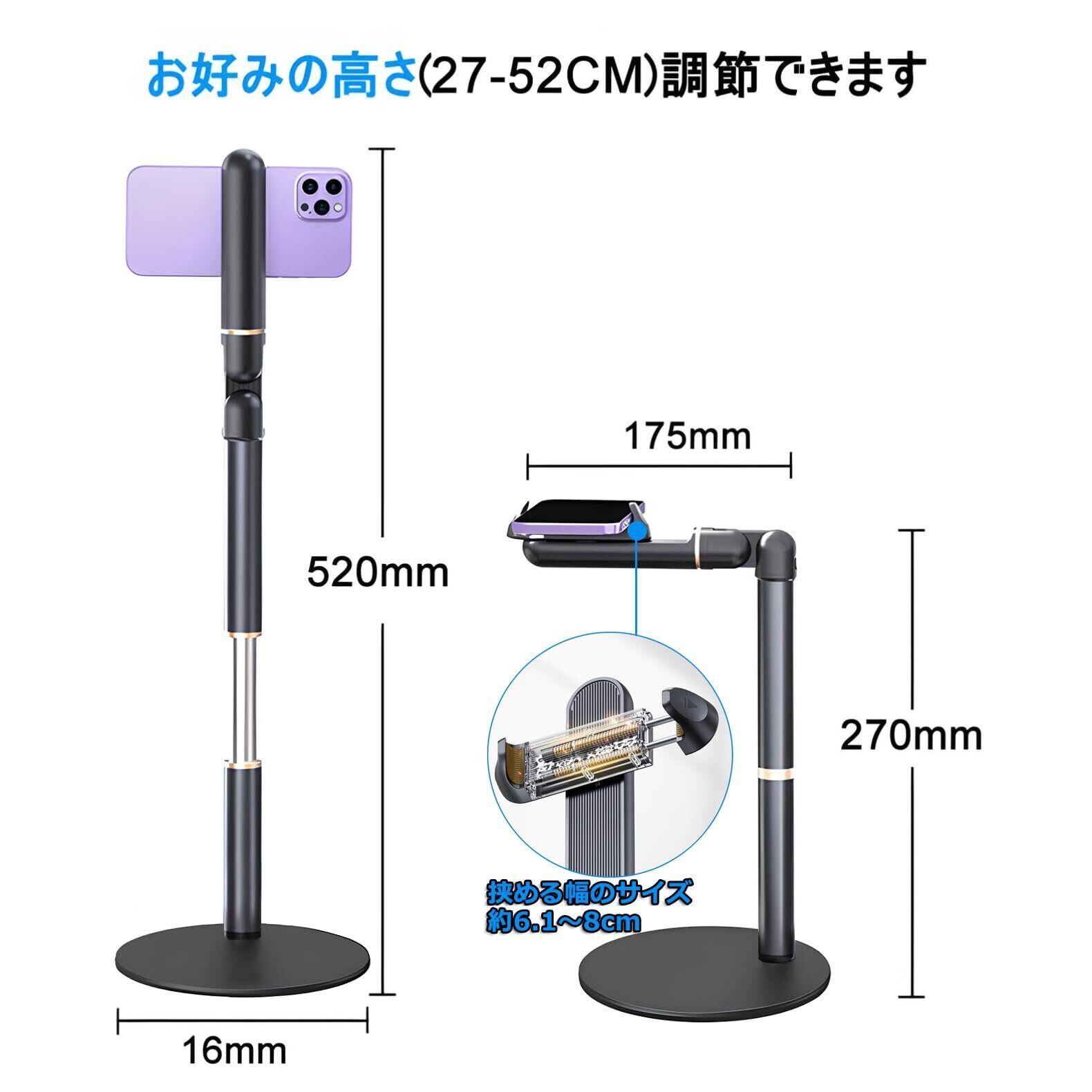 【耐久性と強度に優れる】金属製の柱と重い台座(直径:約160mm、重量:約470g)を使用しており、ずっしりした重量級の安定感は抜群です。料理動画、お絵描きの動画、DIYなど作業中の撮影がブレや揺れなどなくなるようになります。更に台座の底には傷防止用EVA素材の滑り止めマット(クッション)が付いているので、デスクを傷つけないため安心感があります。