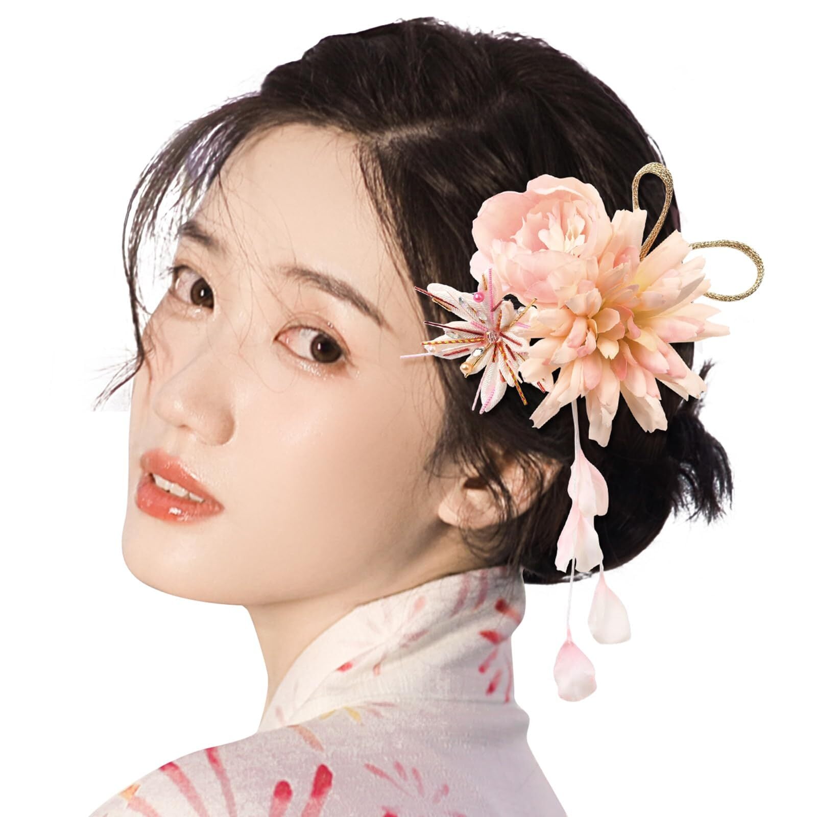 【新春セール】[OTAKUMARKET] 浴衣 髪飾り 成人式 花 七五三 袴 着物 髪 飾り 和装 卒業式 結婚式 髪 飾り 振袖 髪留め 水引き クリップ ヘアアクセサリー 8カラー (04 ライトピンク)