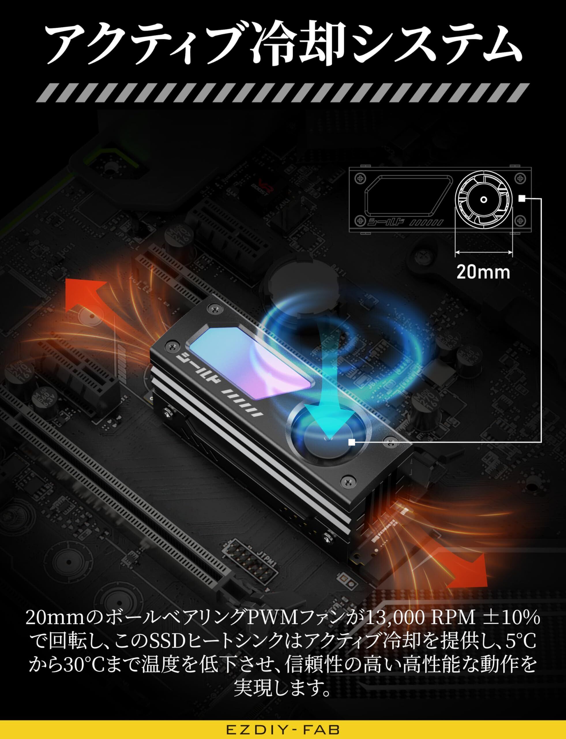 EZDIY-FAB シールド ARGB M.2 2280 SSD ヒートシンク 内蔵 20mm PWM 高速ファン、高性能冷却、アルミニウム製、5V 3Pin ARGB Sync対応、静音設計、効率的な放熱循環、過熱対策、簡単取付、自作PC向け、ゲーム・ビデオ編集向け、SSDの温度管理、ARGB機能付き、黒 - 1パック