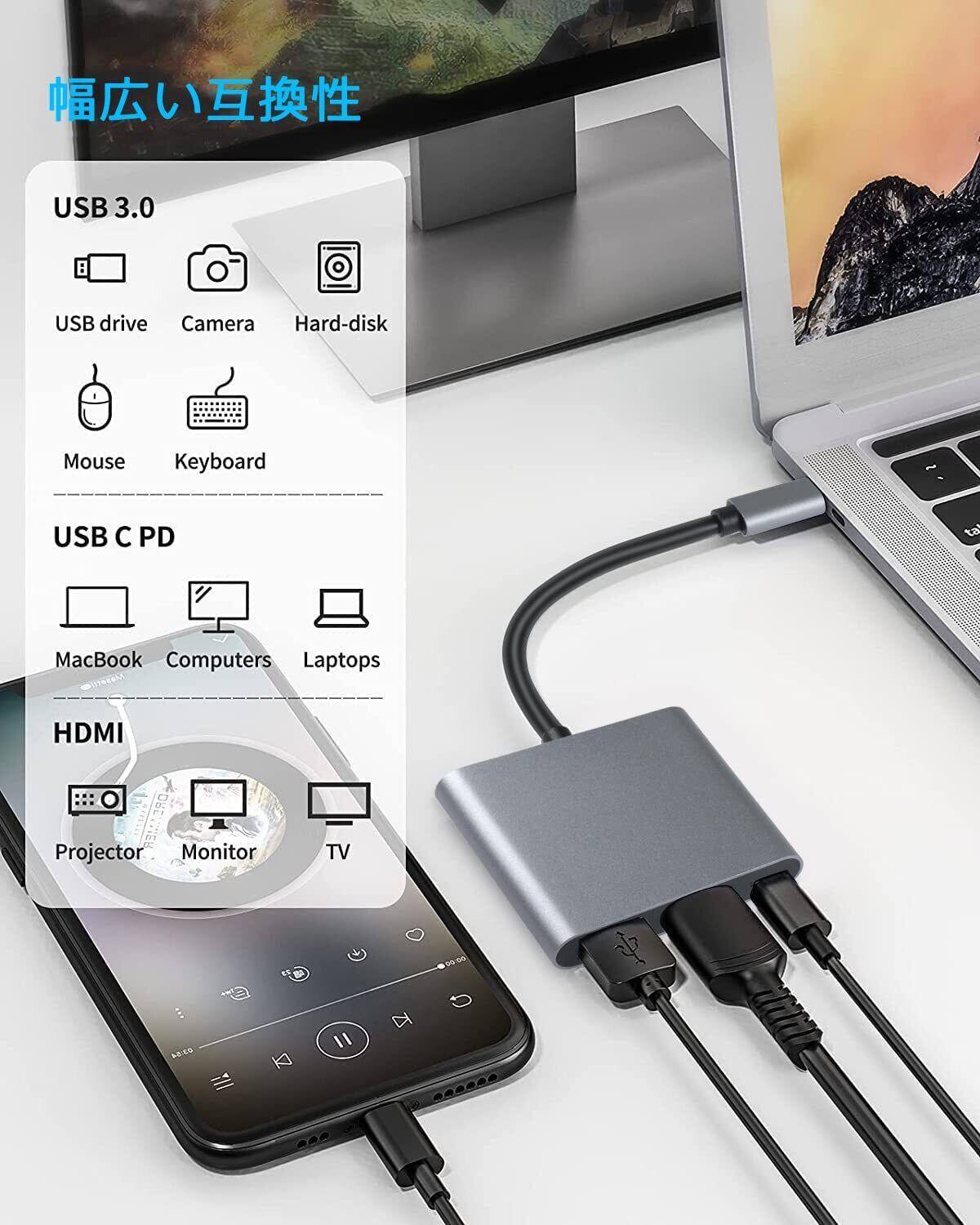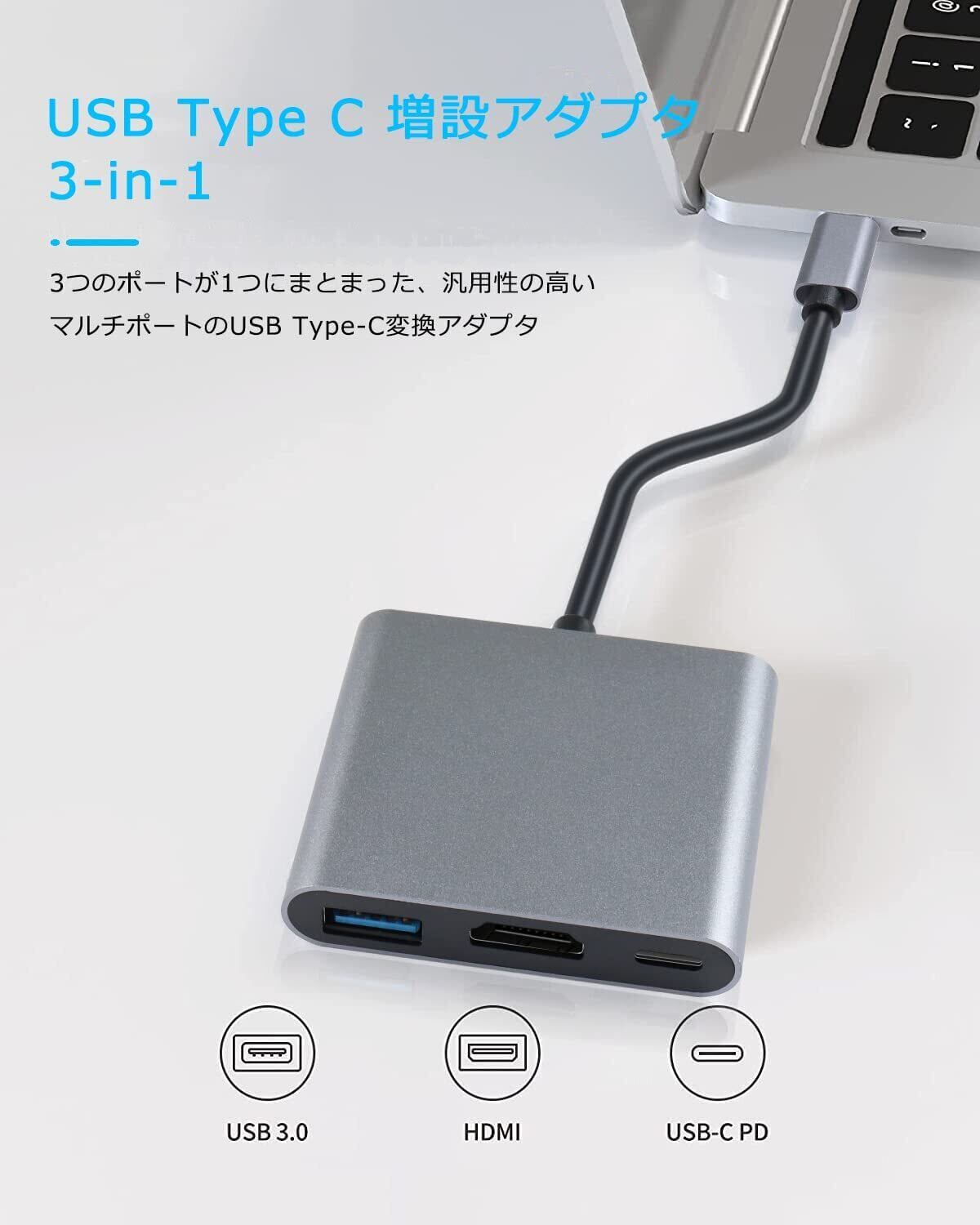 「大人気の3-IN-1 USB Type-C 小型ハブ」:3-IN-1 USB Type-C 小型ハブは、4K解像度 HDMI 映像出力+USB 3.0高速データ転送+PD 100W急速充電など、複数の機能を統合しています。この多機能ハブはオフィス、家庭、旅行など様々なシーンで活躍します。