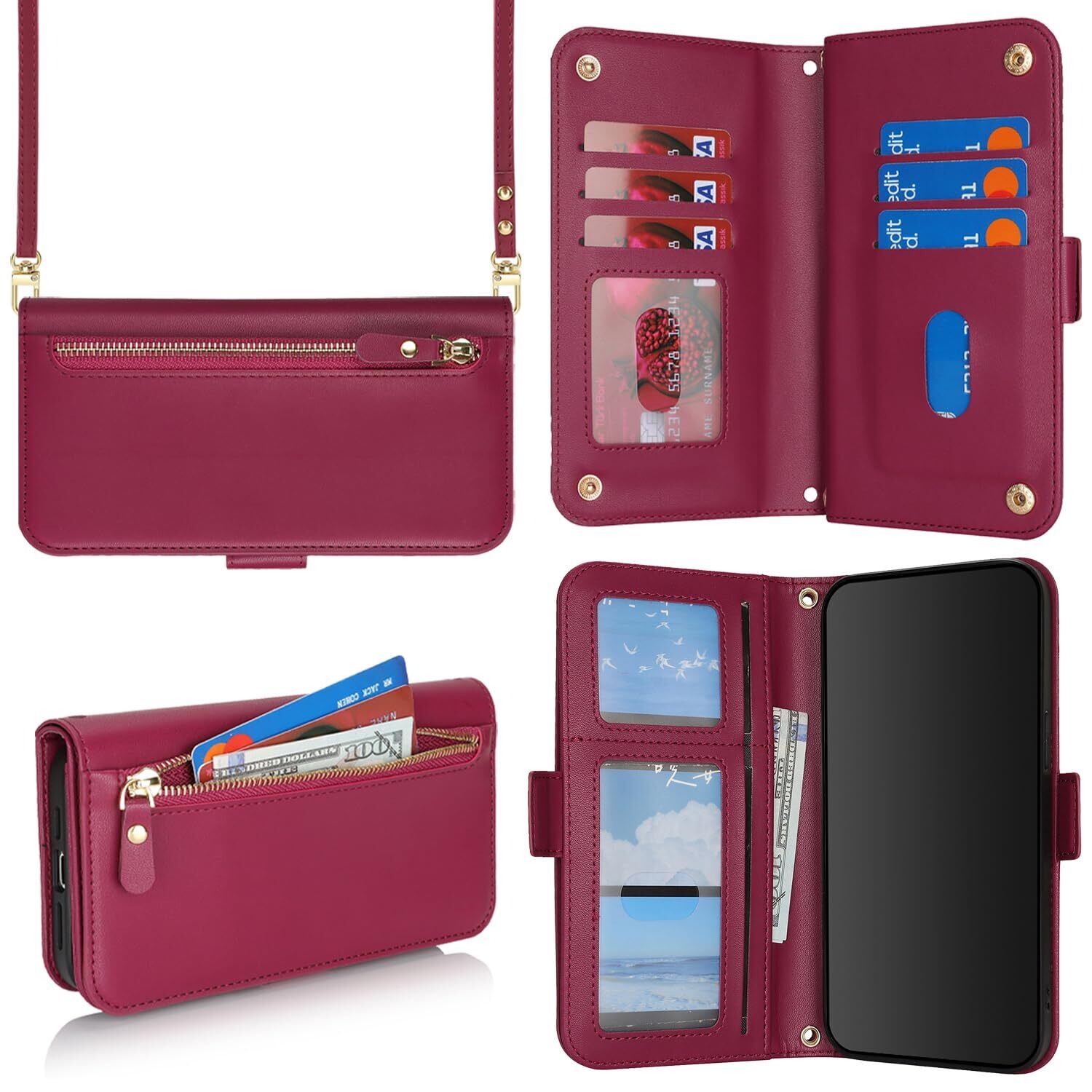 【在庫処分】for iPhone 15 Plus ケース アイホン 14 Plus 肩がけ 首掛け 斜め掛け ファスナー ストラップ付き ショルダーケース 手帳型 CASE カバー SunYoo カード収納 横置き スタント PUレザー 財布型 for 15plus 14plus レッド | allstore3