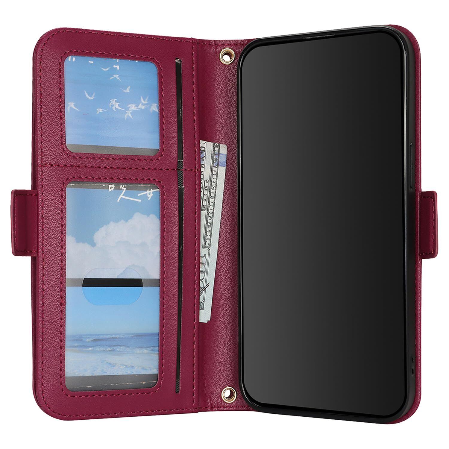for iPhone 15 Plus ケース アイホン 14 Plus 肩がけ 首掛け 斜め掛け ファスナー ストラップ付き ショルダーケース 手帳型 CASE カバー SunYoo カード収納 横置き スタント PUレザー 財布型 for 15plus 14plus レッド
