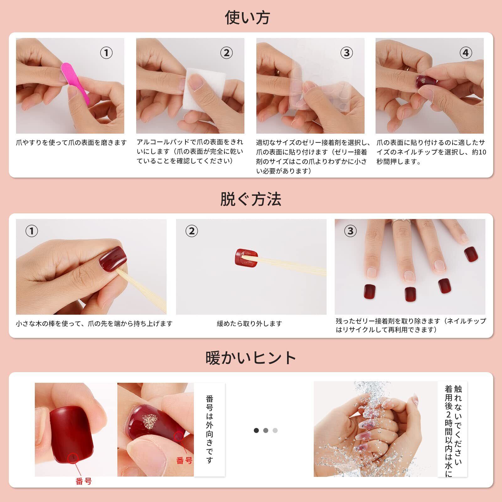 【手に優しく、損傷がない】はがせるジェルネイル、手を温水に10分間浸し、側面から爪をそっと持ち上げて、損傷のない簡単な取り外しを行います。 ネイルバッファーで余分な接着剤を取り除き、ネイルピースを保管して再利用できます。