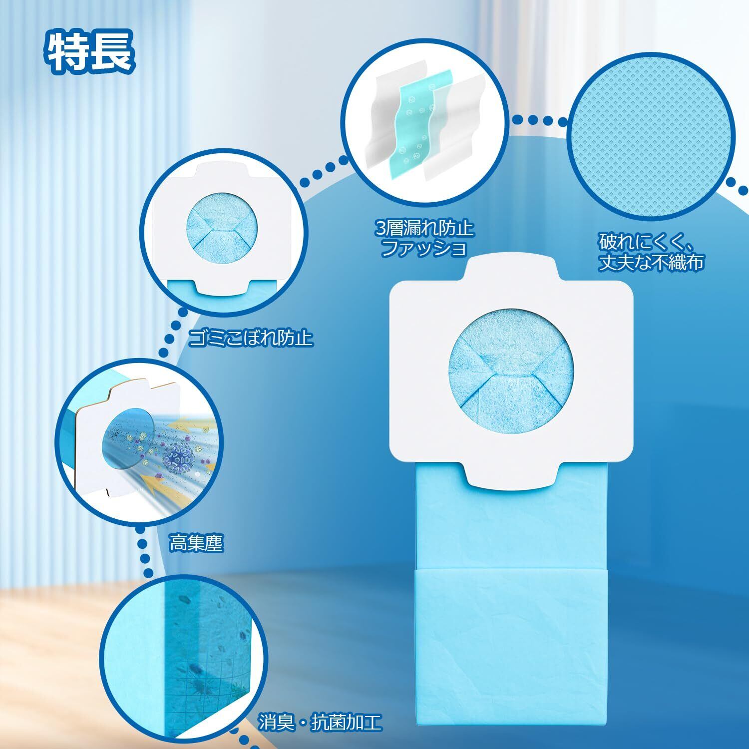 【抗菌紙パック】ゴミに潜む細菌、ウィルス、花粉、ダニなどの粒径0.1μm以下の超微小粒子状物質も99.99%をしっかり集めます。
