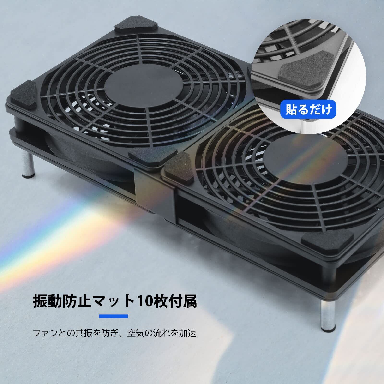 四つの金属製足により、USB ファンが平面から27mmの高さを離れて、十分の風量を確保します。また、振動吸収マットも搭載されおり、振動による騒音を抑えています。