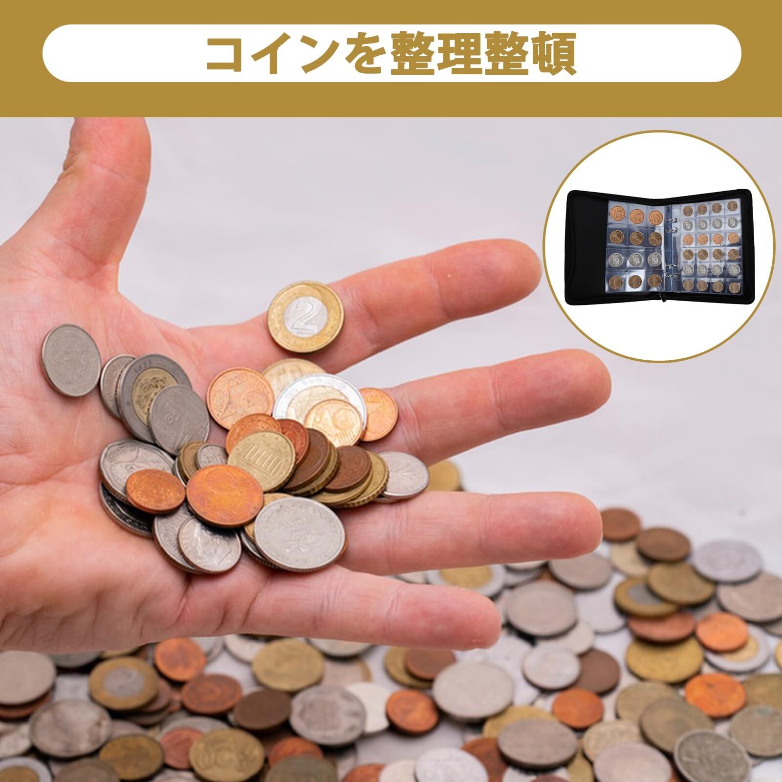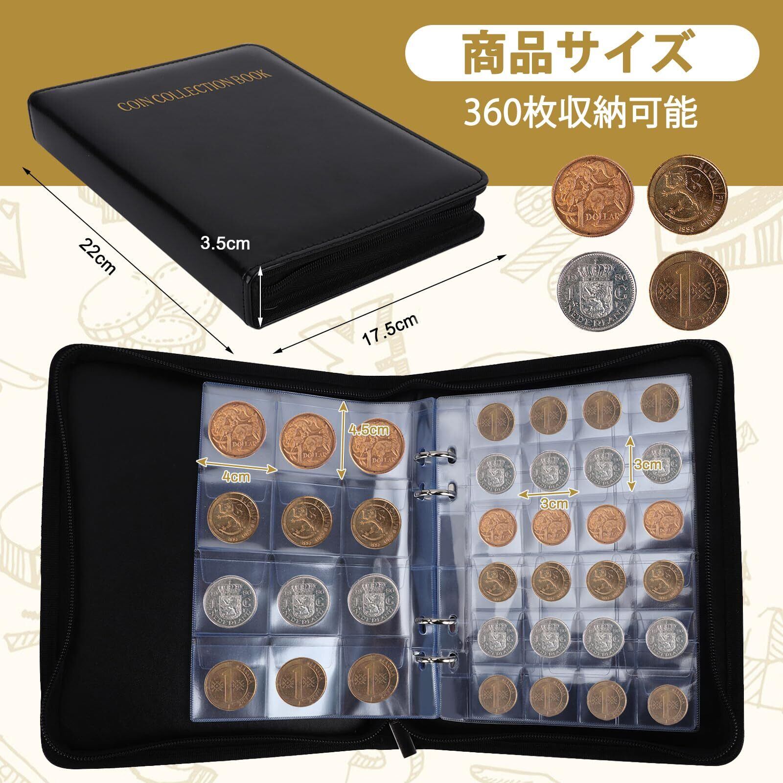 コインアルバム 硬貨ケース コイン収納 360枚収納可能 長さ17.5 cm幅22 cm高さ3.5 cm バインダー式 ファスナー付き コイン アルバム コレクション ホルダー 収納ファイル コインケース 記念硬貨 古銭 貨幣 コンパクト ブラック