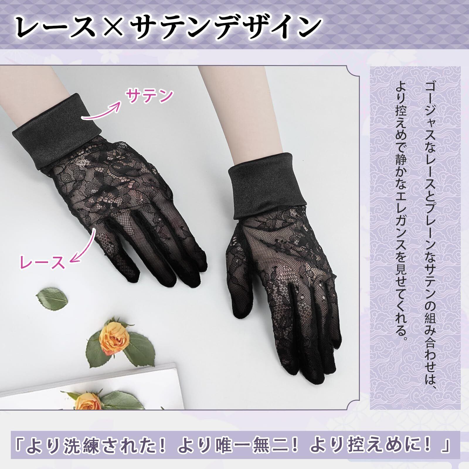 【レース手袋 光沢】レースの透け感で涼やかに、サテンの光沢で手触り快適。異素材の融合が、美しさと使いやすさを一つの形に。真夏でも長時間着用できます。