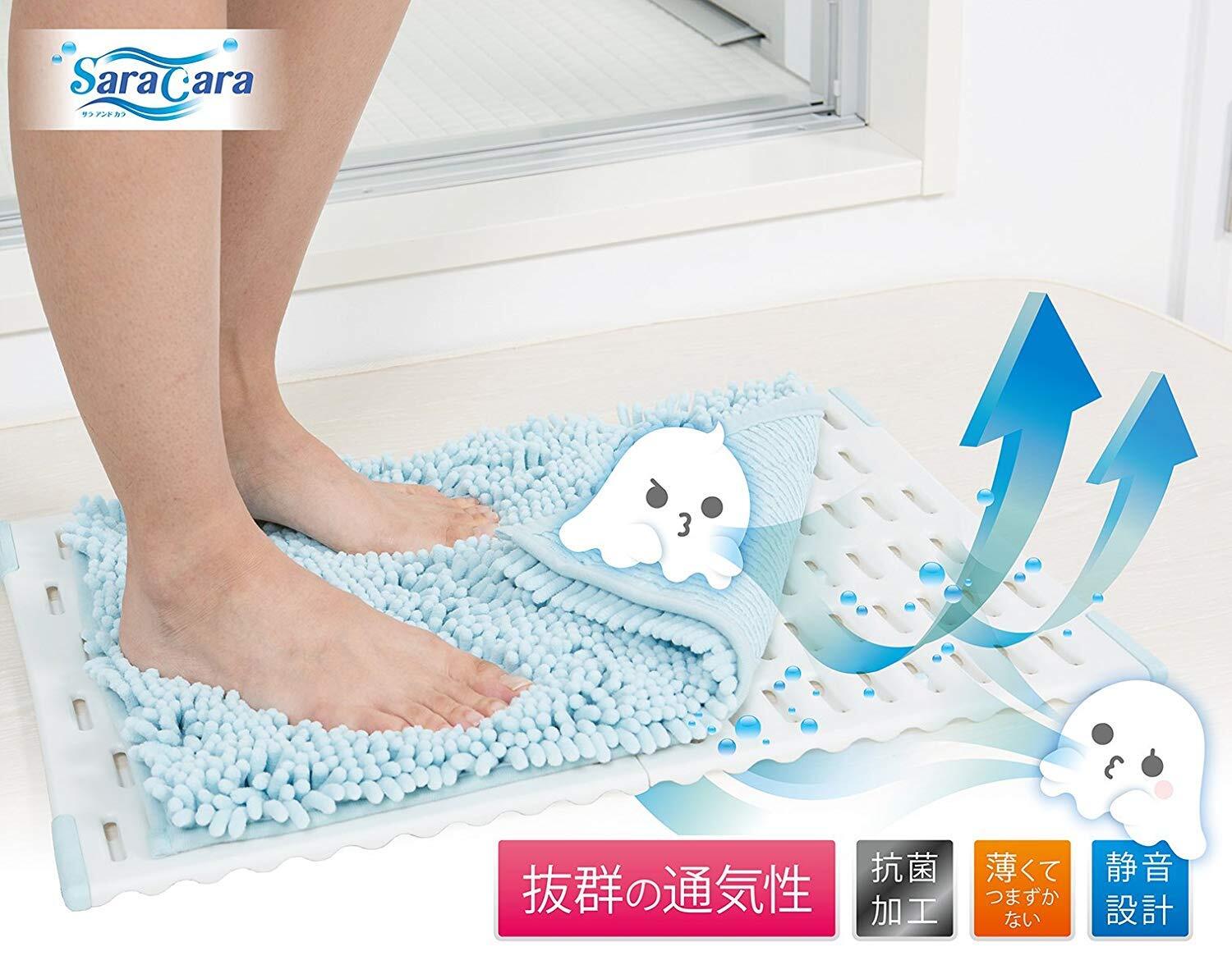 【通気性】凹凸面と立体ホールにより、優れた通気性を実現。床面を湿気から守り傷めません。カビの発生を抑制させ、清潔に保つことができます。湿気がたまりやすいバスマットが乾きやすくなるため、複数人で使用する場合でも、サラッと乾き、お風呂上りがより快適になります。【バスマットを干せる】バスマットを使い終わった後に、山型に立て干すことができるため、次に使う時も快適に使用することができます。ベランダなどに干しに行く手間を省くことができます。【薄型·軽量設計】厚み約1.2cmの薄型設計のため、つまづきにくく、脱衣所の邪魔になりにくい仕様です。また軽量のため楽に移動·持ち運ぶことができます。【滑り止め】裏面に滑り止めクッションを等間隔で配置。四つ角にグリップの効いたエラストマーの滑り止めを取付けているため、使用時にはずれにくく、踏み心地に優れます。また山型に立て、バスマットを乾かす時も、滑りにくく、倒れにくい仕様です。【収納性】使わない時は2つ折りに畳むことができるため、脱衣所の隙間など場所を取ることなく収納することができます。【耐荷重】200kg。【原産国】日本
