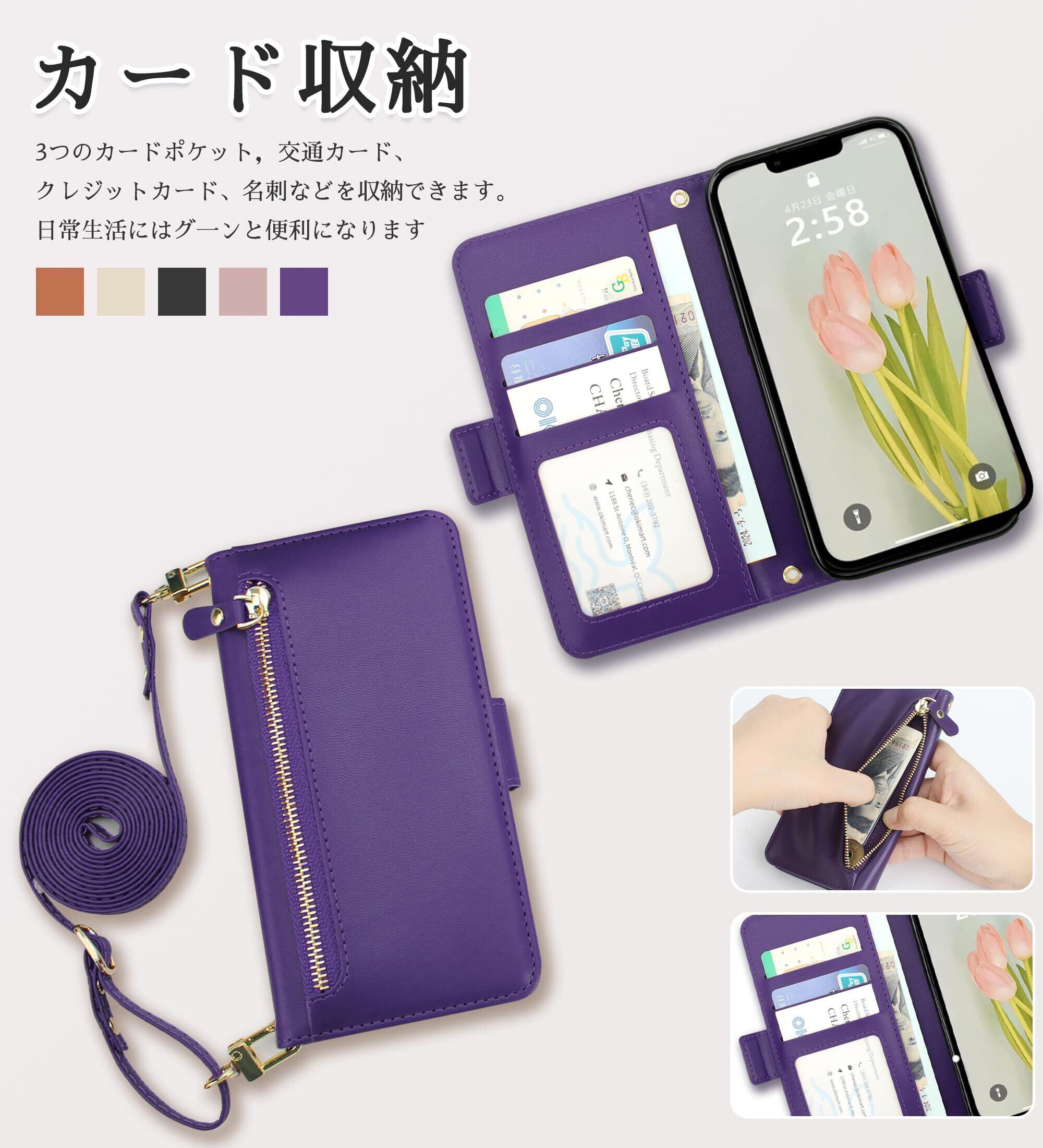 CLICSUN iPhone 14 ケース 手帳型 ショルダー いphone 14 斜めがけ ケース 財布型 携帯ケース アイフォン 14 肩掛け 小銭入れ カード収納ロングストラップ 長さ調節可能 衝撃吸収 ICカードホルダー PUレザー (ディープパープル)