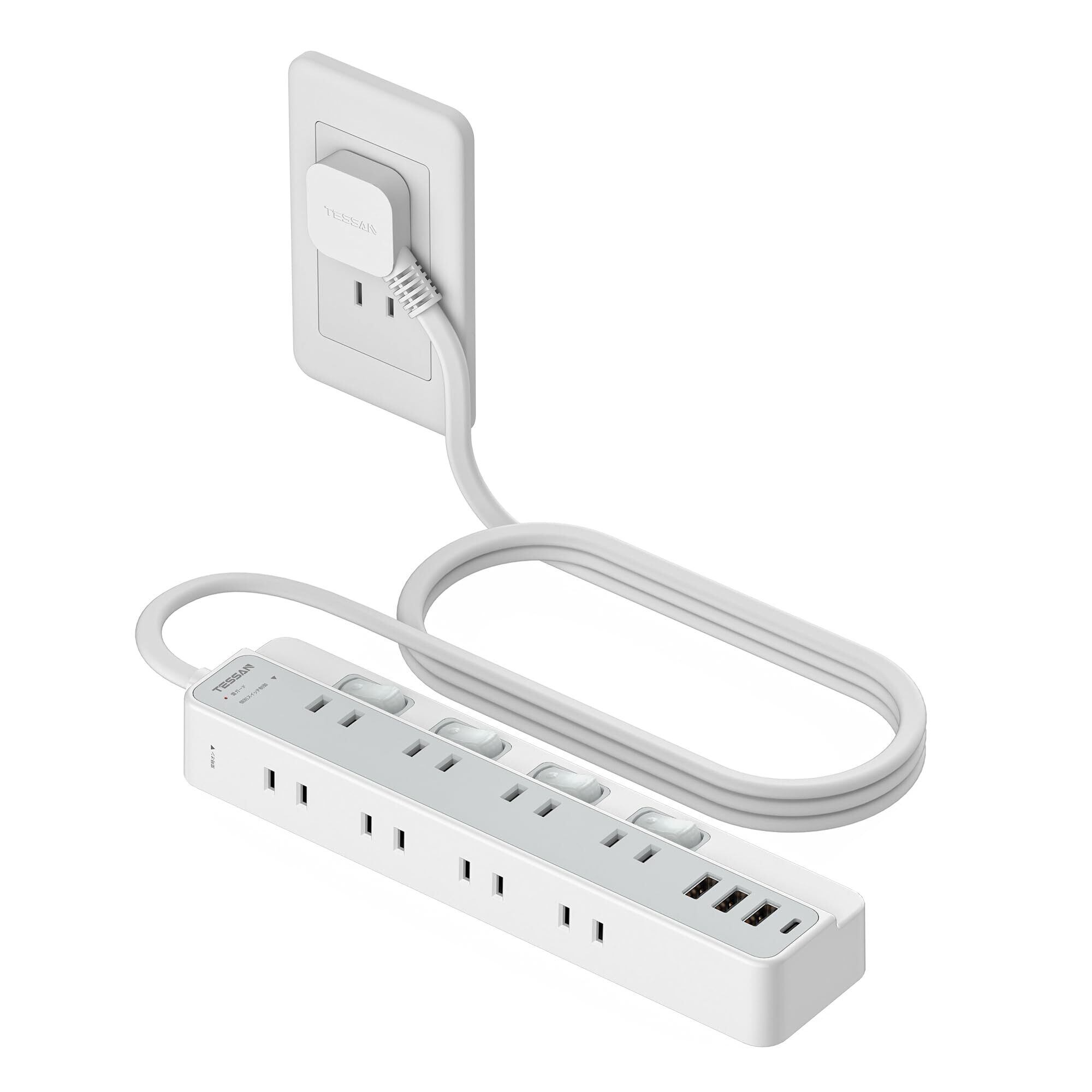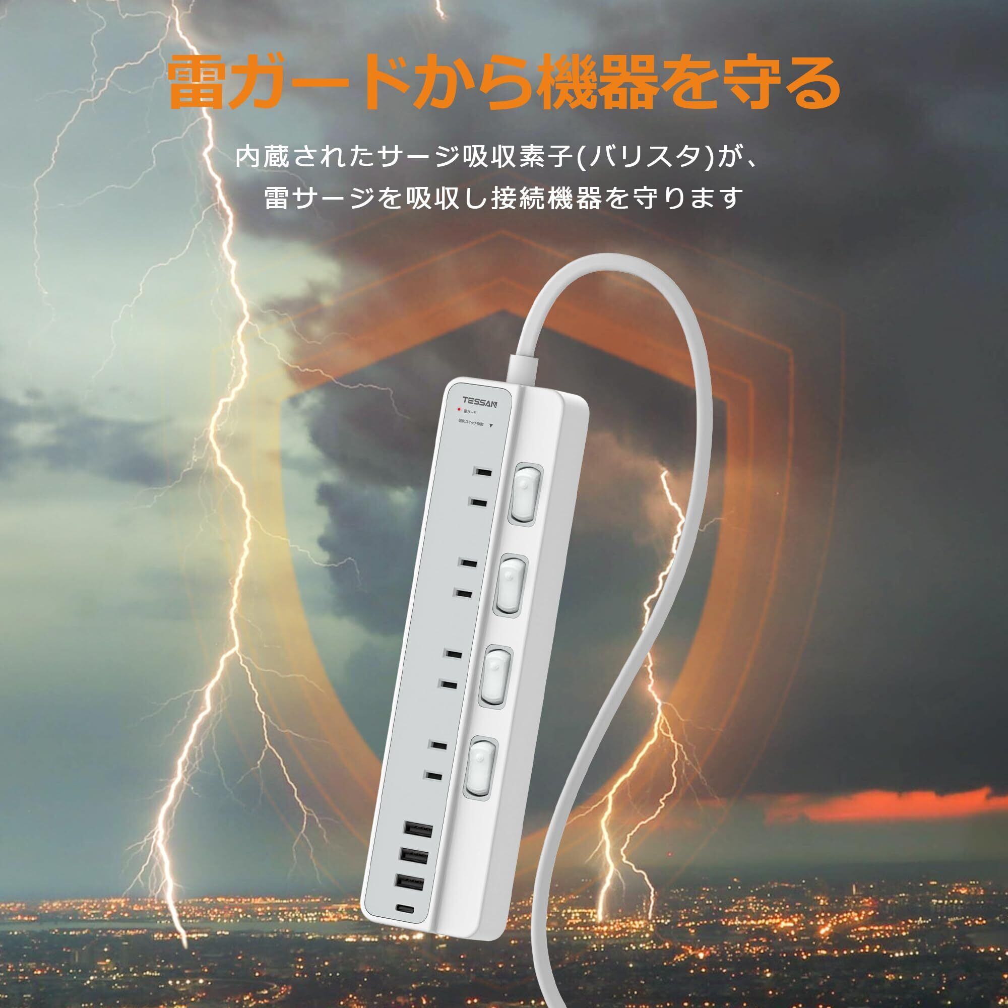 電源タップ usb付き 延長コード 2m 薄型 たこあしコンセント usb付き テーブルタップ TESSAN 8個AC口 1個Type-Cと3個Type-Aポート 延長コード 薄型プラグ タコ足配線 隙間 蛸足コンセント 分岐 4つ個別スイッチと4つ常時通電付き 節電 省エネ ほこりシャッター 雷ガード 壁掛け/卓上に ホワイト