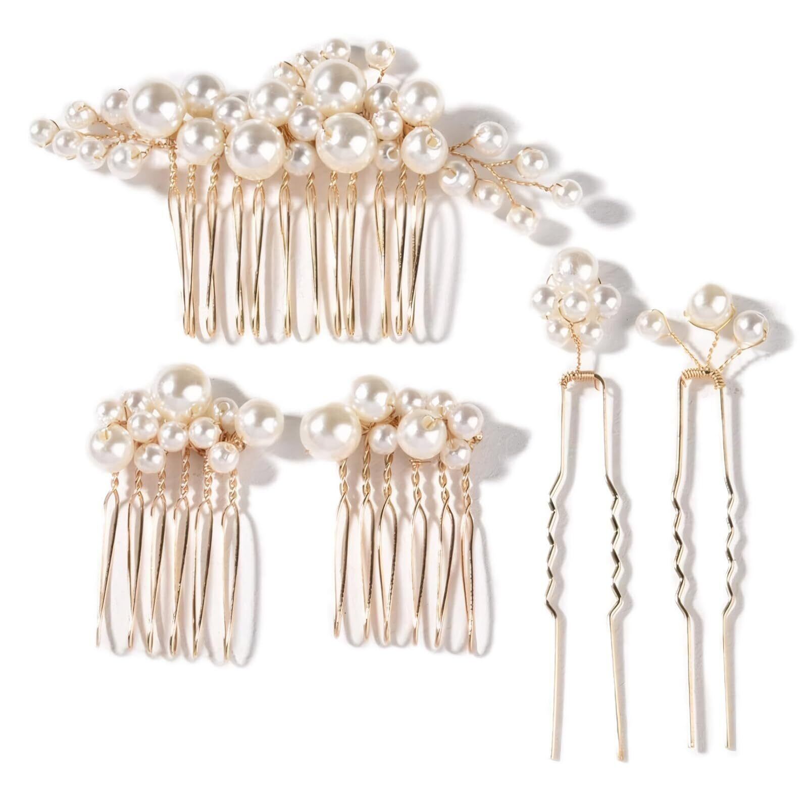 【お得な5点セット】材質:イミテーションパール、合金。セット内容:大きいパールヘアアクセサリー*1、小さいパールヘアアクセサリー*2、パールヘアピン*2。