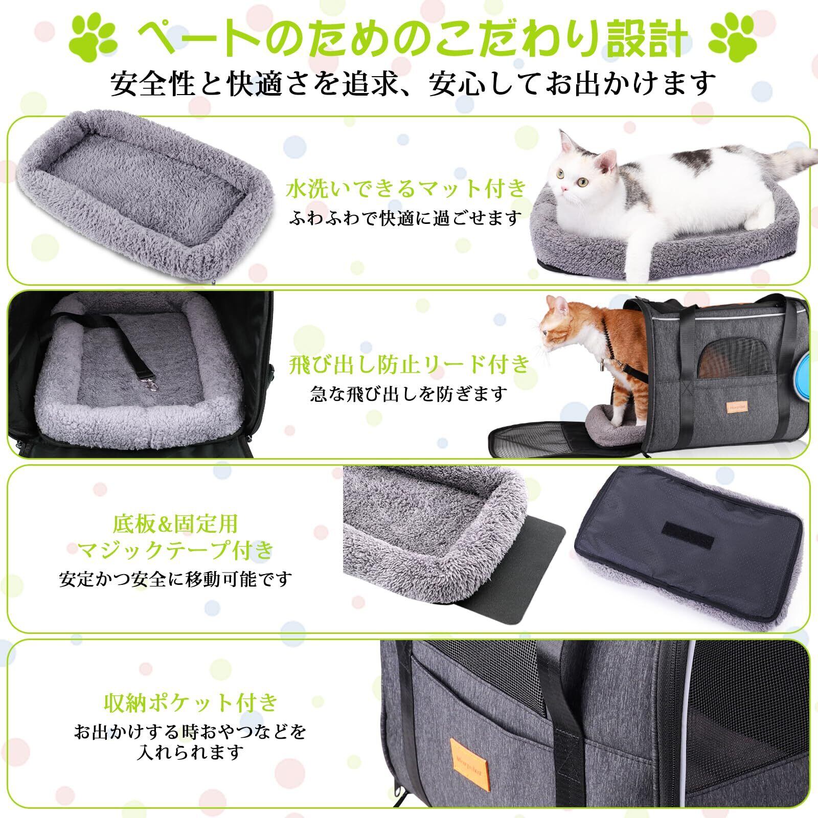 【優れた安全性】ペットの健康を考え、一年かけてテストを繰り返し、最終的にペットに最適な材質を採用しました。全てのファスナーがロック式のダブルファスになっておりますので、少しヤンチャな可愛いペットも安心です。底部にも滑り止めマットが付き、安定性が良いデザインです。クッションは取り外し可能。突然の飛び出しを防止できる専用リード付き安心してお出かけ出来ます。